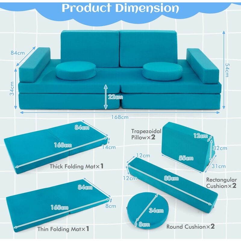 Enjoy endless fun with our 10-piece kids modular play sofa set! Featuring 2 trapezoidal pillows, 2 rounded cushions, 2 rectangular cushions, a thick folding mat and a thin folding mat, the sofa set offers endless possibilities to stimulate creativity, Imagination, motor skills and logical capability. Plus, these cushions can be easily moved with a practical black fabric handle. Moreover, our 10-piece sofa set offers various free combinations such as sofa, fort, tunnel, bridge, car, tent, slide, bed lounge or anything your kids can imagine. Additionally, features machine-washable fabric and smooth zippers, the soft suede cover can be removed easily for machine washing. Made from durable & child-friendly material, the sofa is not easy to deform. It is a perfect gift for your kidsï¼