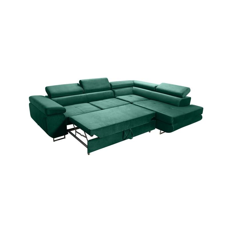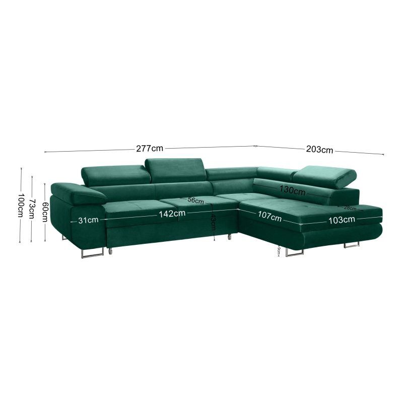 Our Aston Corner Sofa bed is a modern piece of furniture, ideal for the living room, guest room, playroom or conservatory. This sofa can be made of velvet-like upholstery, cord upholstery, mixed pleat upholstery, or faux leather. This sofa contains a lifting mechanism to transform it easily into a bed. The mattress of the sofa is medium firm. The sofa contains one storage compartment. Please check the dimensions before purchasing. The Aston sofa comes in two large pieces; please contact us before buying so we can ensure the sofa will fit through.