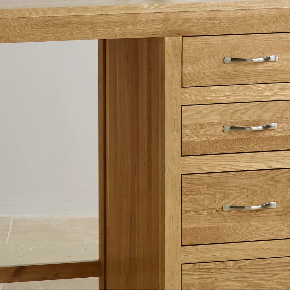 The Bevel Natural Solid Oak Dressing Table is designed to offer the ideal place to fix your make-up and hair in style. Made from premium grade solid oak, it features four generously-sized drawers which will provide ample storage space for your accessories. As with all drawers at Oak Furnitureland, each one is constructed using traditional dovetail joints with solid oak backs, bases and runners. Quality design features include expertly mitred joints on a subtly bevelled frame, and elegantly angled corner feet. To ensure a long-lasting, natural lustre, each piece from the Bevel range is finished with a clear wax polish. We recommend this is reapplied every three to four months to keep your furniture looking its best.