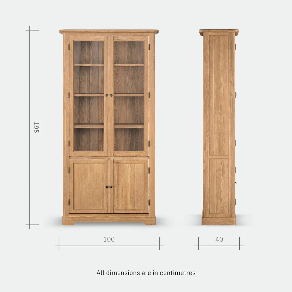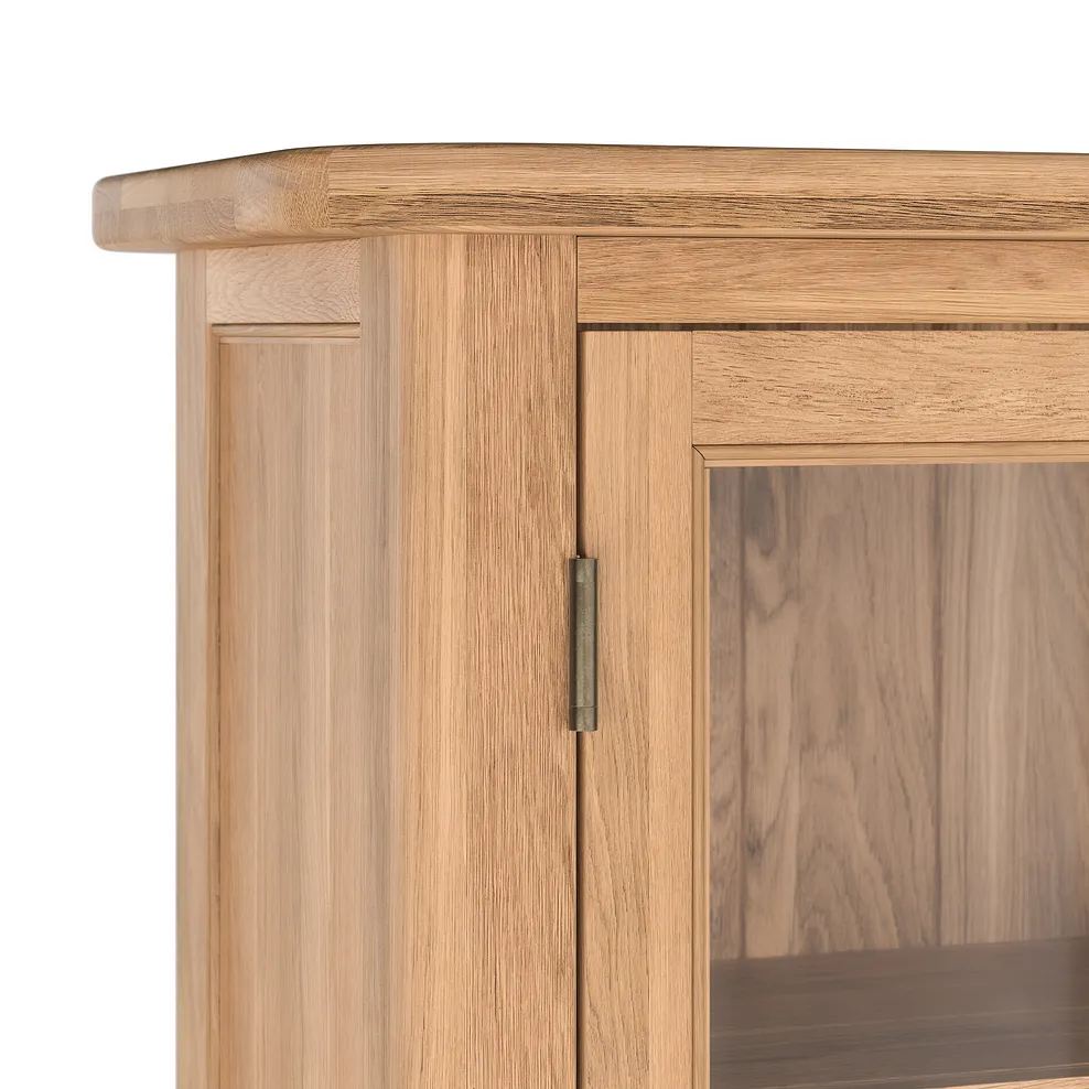 The Brennan solid oak display cabinet is beautifully crafted from 100% solid oak. This piece combines durability with classic design, making it a beautiful addition to any living or dining space. The cabinet features 3 open display shelves, perfect for showcasing your favourite books, ornaments, or cherished family pieces. Each shelf is framed by softly rounded corners, giving the cabinet a welcoming, gentle character while maintaining a refined silhouette.