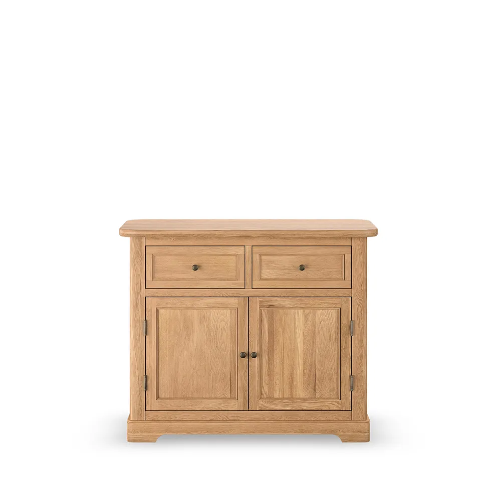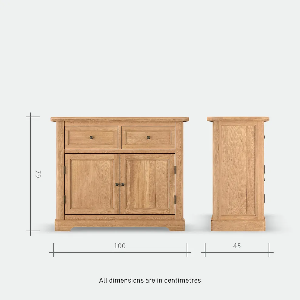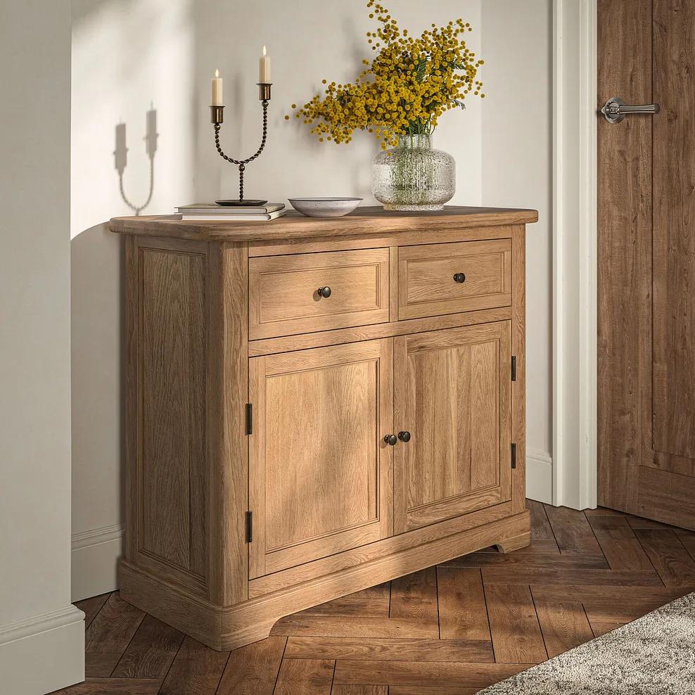 This beautifully crafted Brennan small sideboard is ideal for compact spaces. Made from 100% solid oak, it features 2 spacious drawers and a pair of cupboards, ideal for keeping dining essentials, cutlery, and household items neatly tucked away.