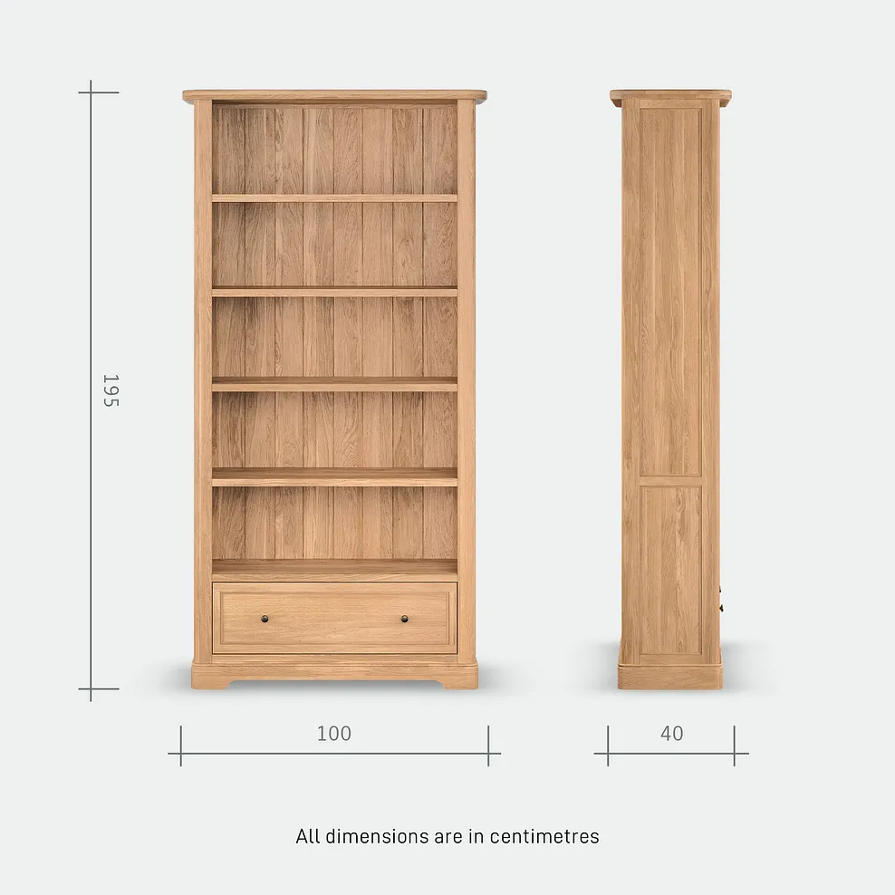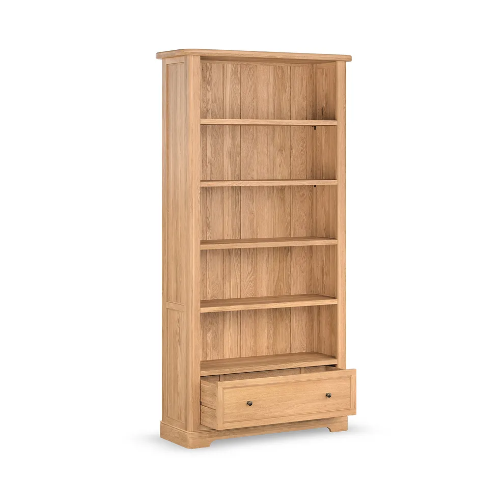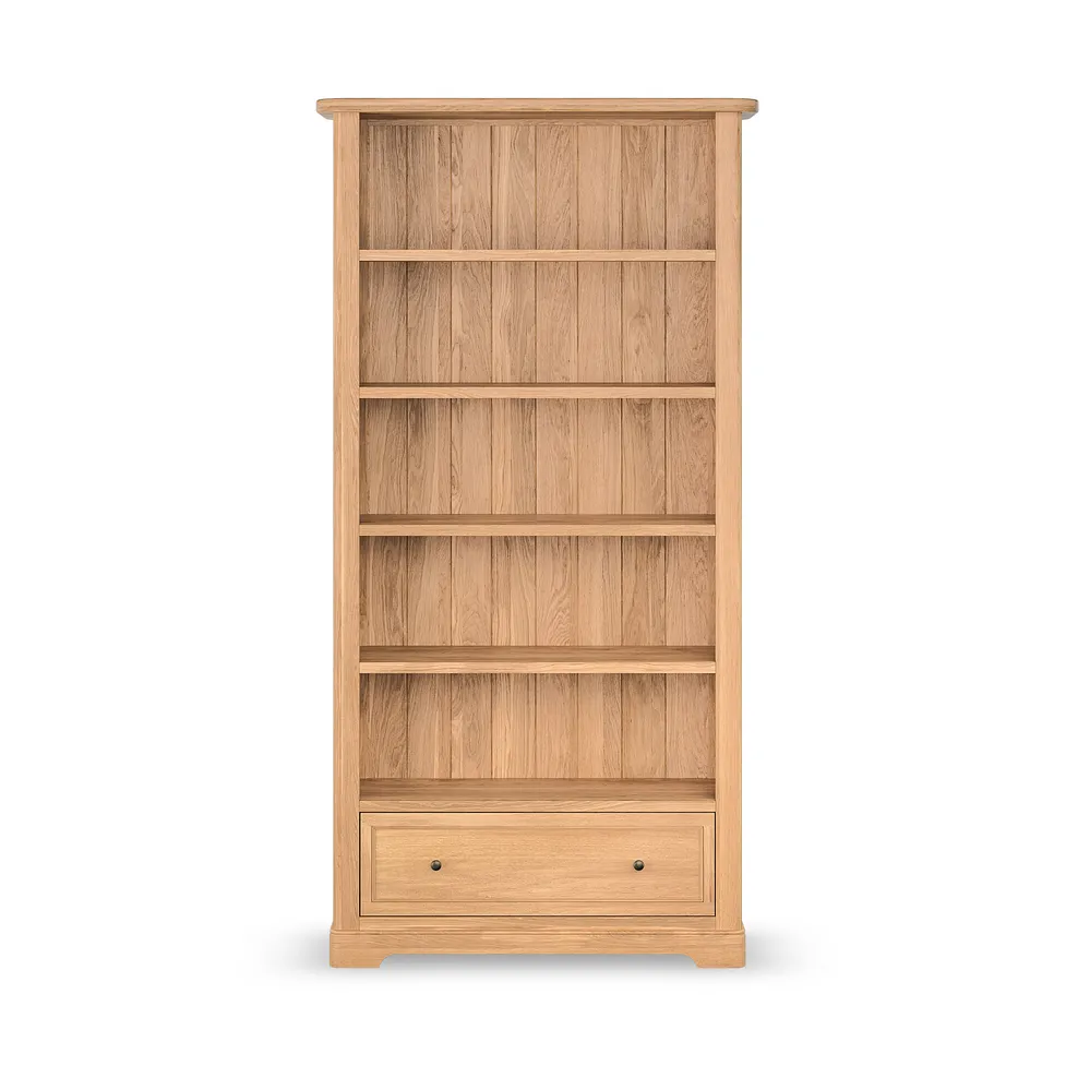 Expertly made from 100% solid oak, the Brennan tall bookcase combines classic design with subtle detailing that makes it both practical and beautiful. With 4 spacious shelves, it offers the perfect home for books, ornaments, or treasured keepsakes, while the deep drawer at the base provides discreet storage for those everyday essentials.