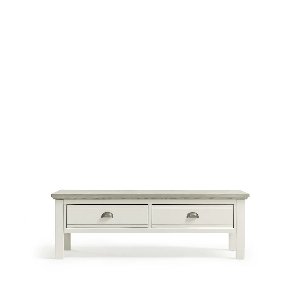 The Brompton coffee table brings together classic Shaker-style furniture and modern functionality to offer a piece that works perfectly for contemporary homes. Complete your living room look with the 2-drawer coffee table, offering dual-purpose use for resting drinks and snacks, while also featuring useful storage for hiding away remotes, games and magazines. Practical and stylish gunmetal cup handles complement the warm paint colour and the beautiful natural wood grains of the ash table top.