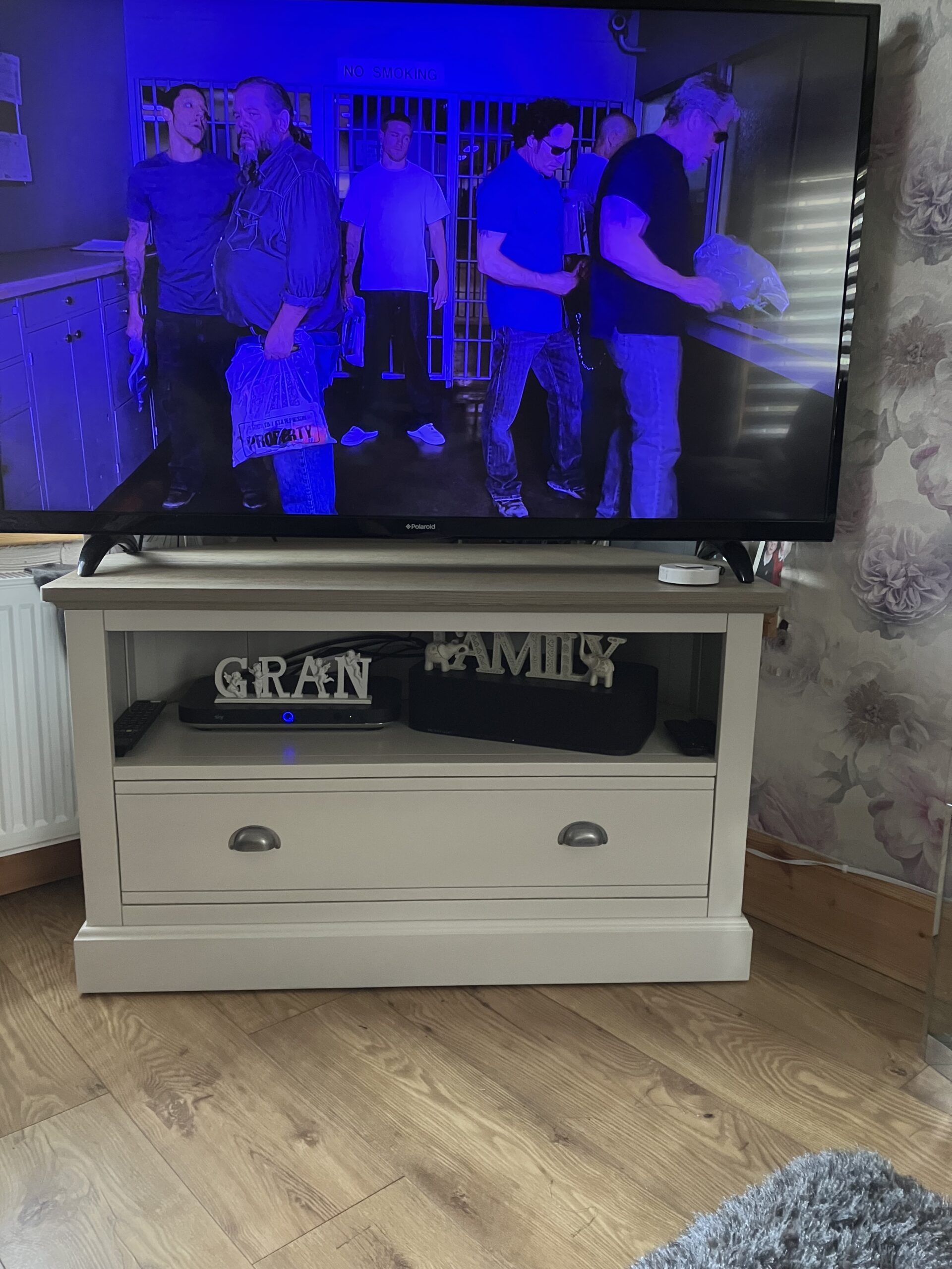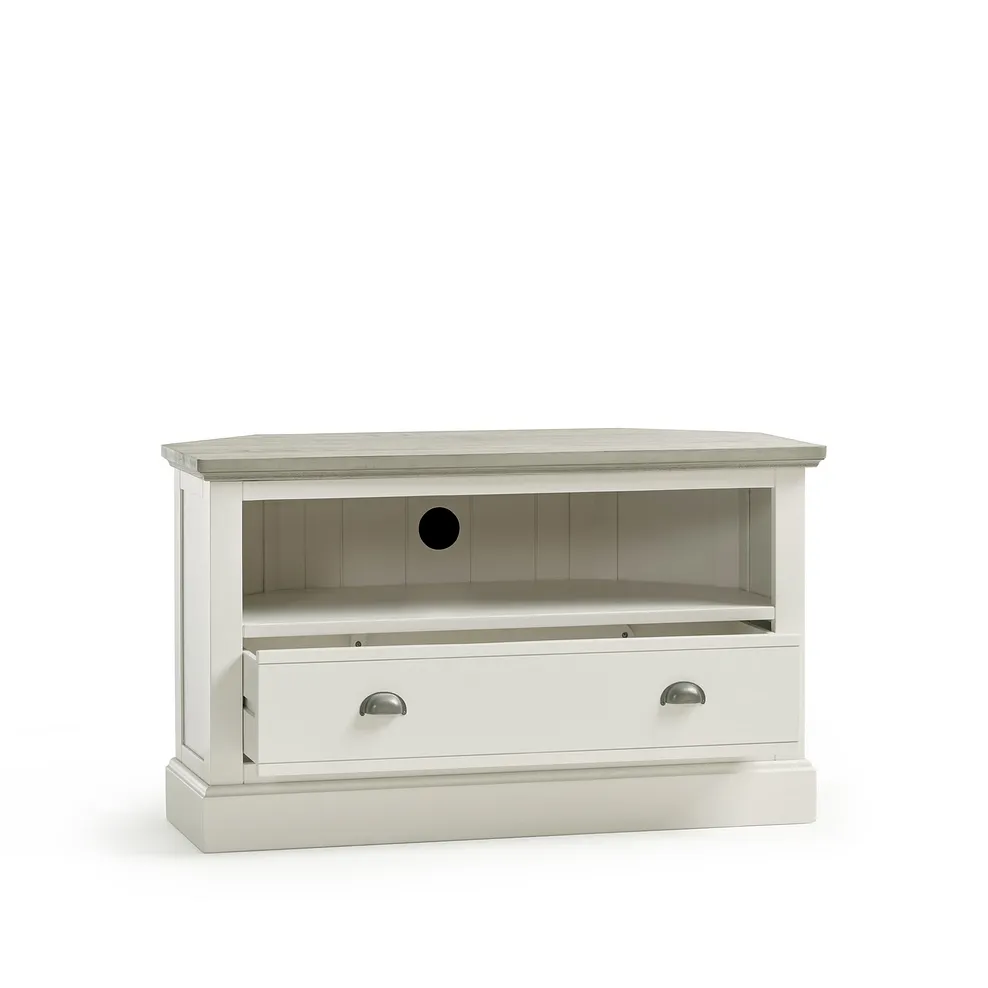 The corner TV unit matches beautifully with other pieces in the Brompton range, offering a complete look that brings country-inspired decor to life.