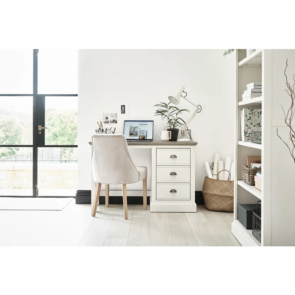 The desk matches beautifully with other pieces in the Brompton range, offering a complete look that brings country-inspired decor to life.