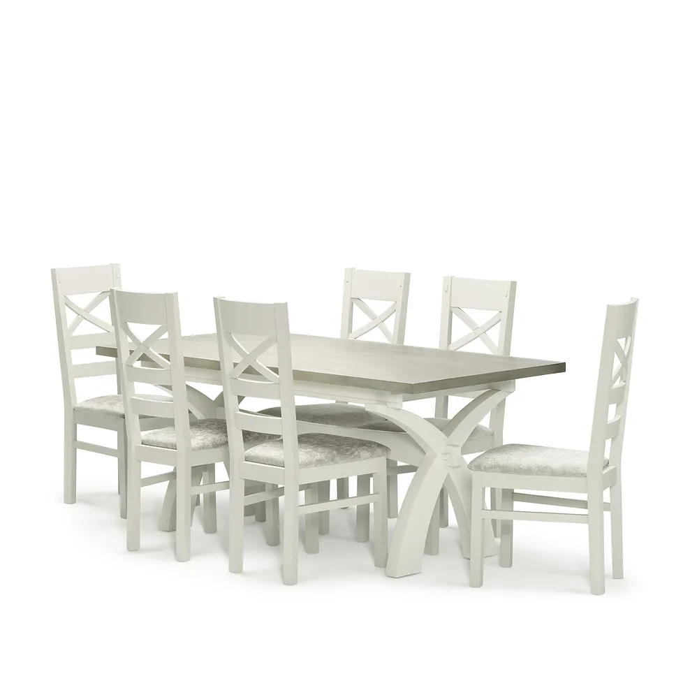 Gather round and enjoy mealtimes to remember at the Brompton dining set. The elegant painted acacia and ash top table is teamed with six Brompton dining chairs, painted in a smooth off-white and finished with Plain Truffle upholstered seats, to offer a complementary pairing that adds understated style to your home.
