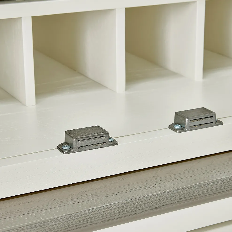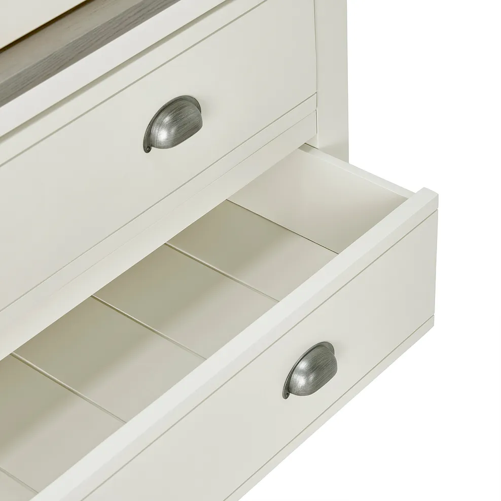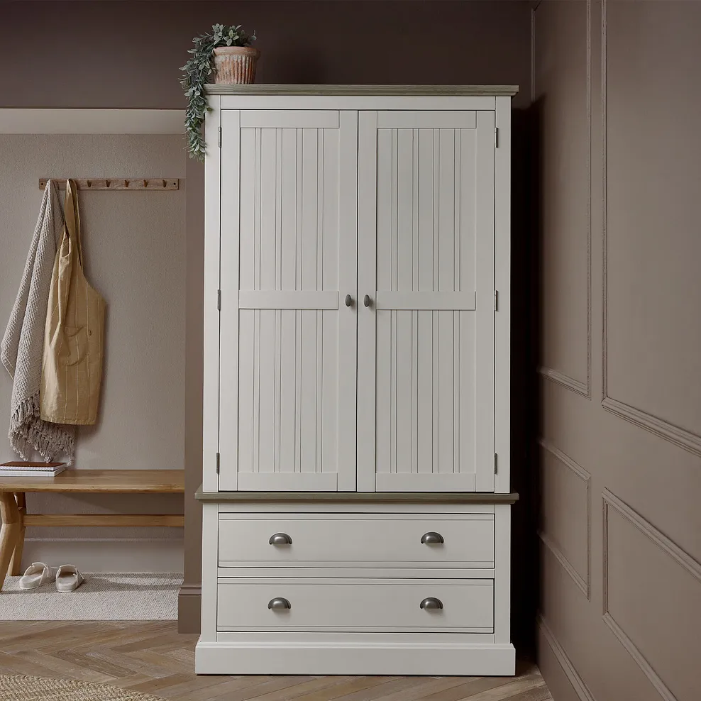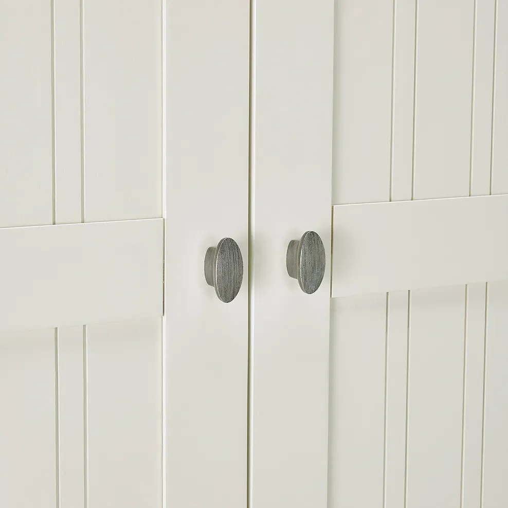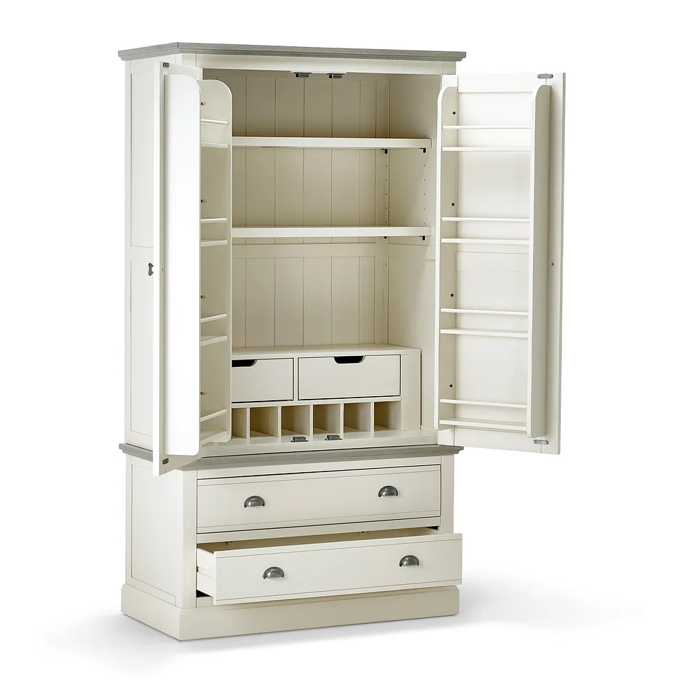 Crafted from solid acacia and painted in a soft off-white, this elegant Brompton Large Larder blends classic design with modern functionality. The solid ash top, finished with a durable lacquer, adds warmth and contrast, while showcasing the beauty of natural hardwood.