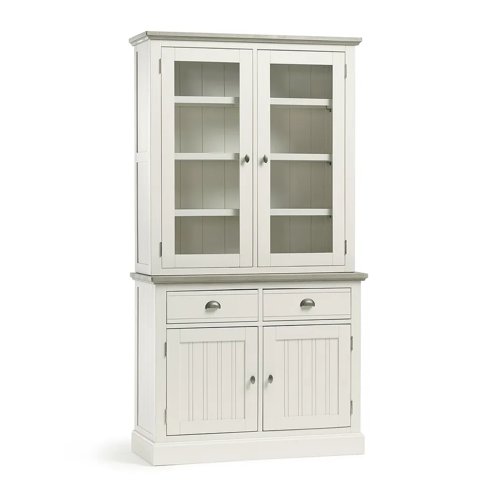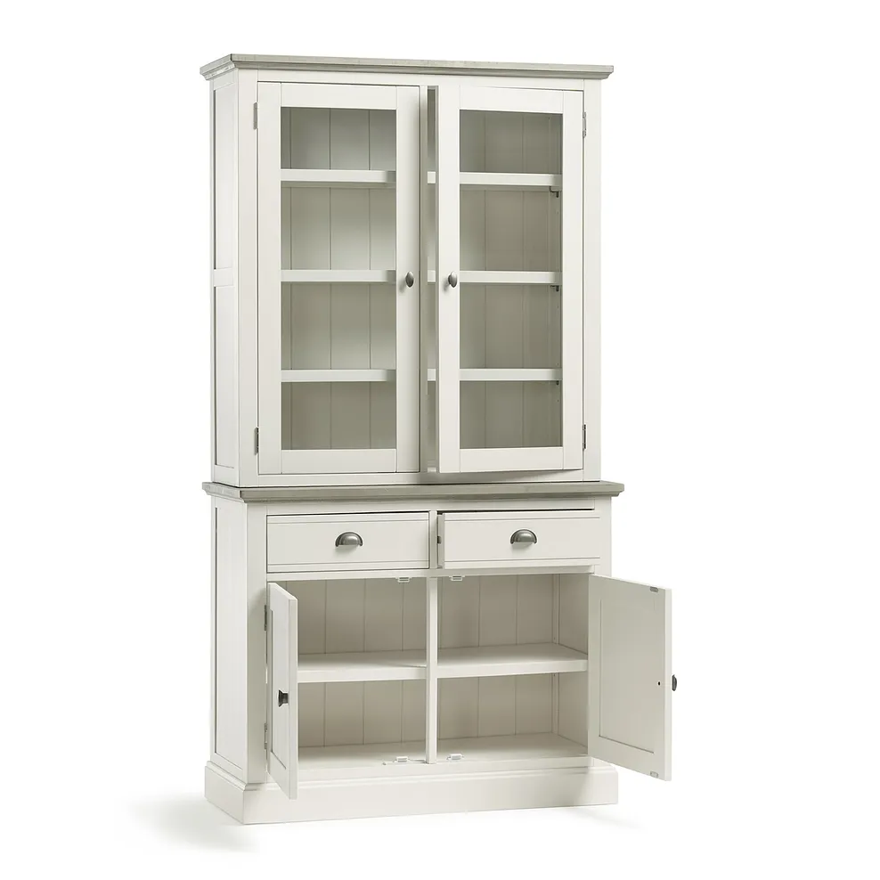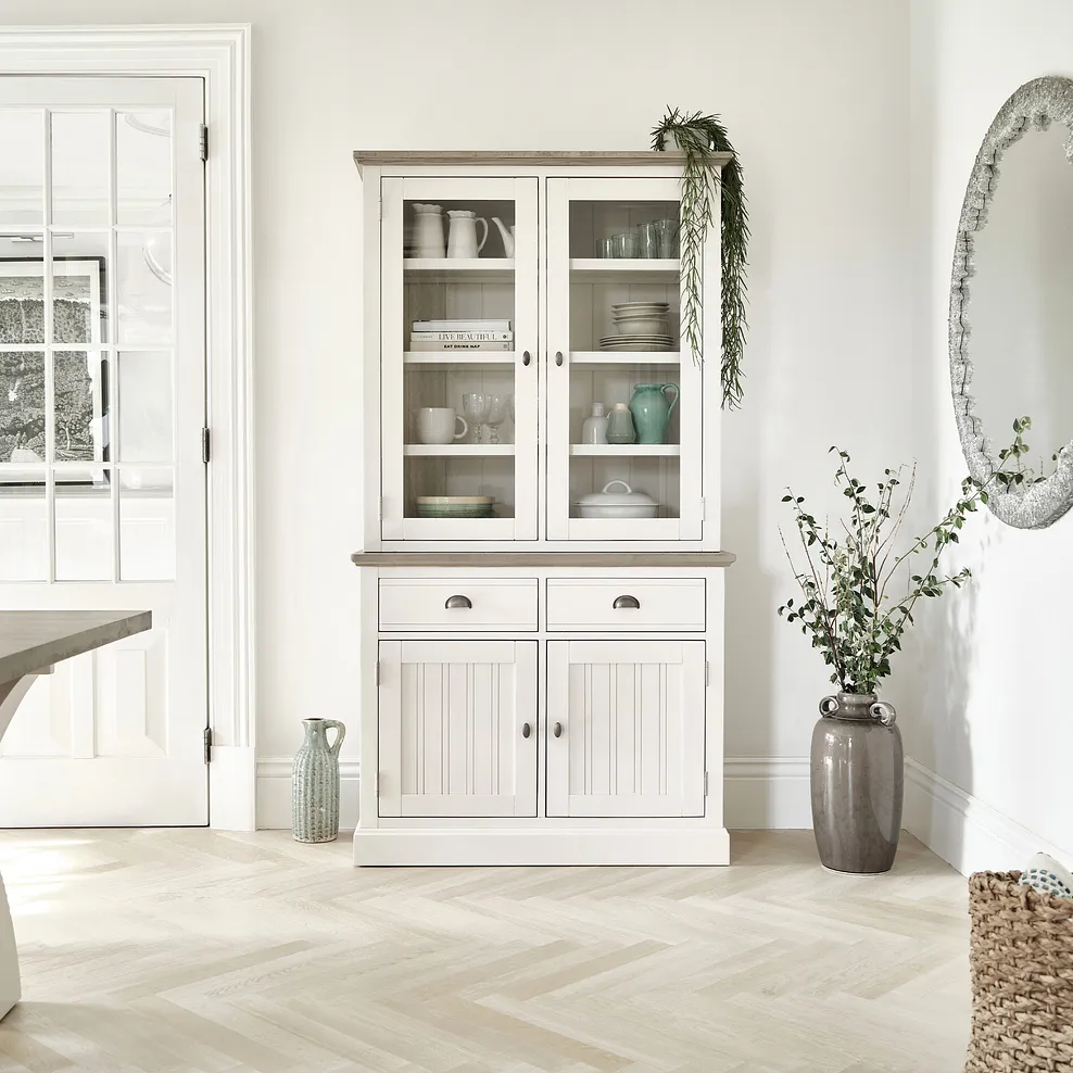 The Brompton small dresser is inspired by rural living and brings rustic Shaker-style charm to dining rooms and kitchens. The glazed unit features two cupboards that open up to offer four shelves for storing everything from crockery to glassware. The dresser also benefits from two drawers and additional cupboard space to organise and hideaway pots, pans and baking essentials. Gunmetal cup and oval handles complement the farmhouse aesthetic.