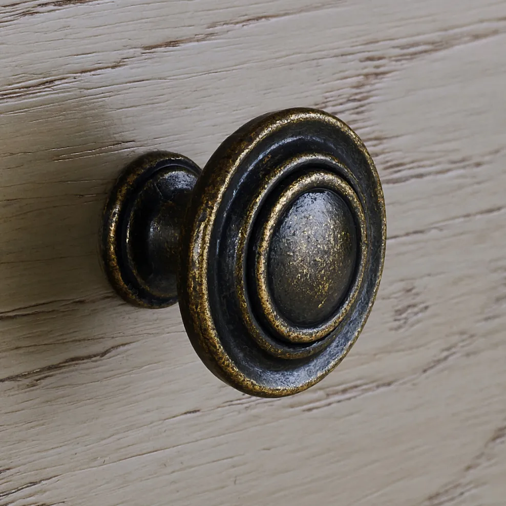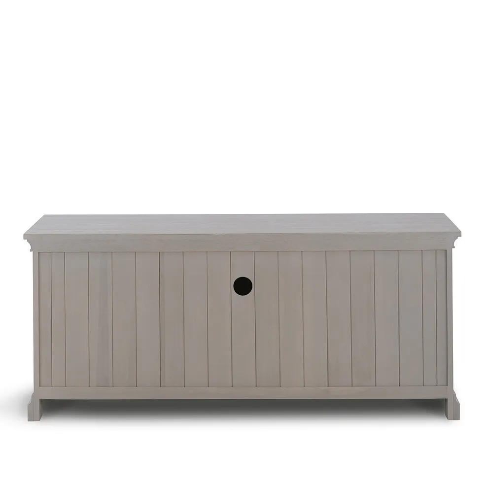 This piece is distinguished by a flared base and top and round metal handles with an antiqued finish. The oak exterior has a warm weathered look that adds a homely feel to this grand TV unit.