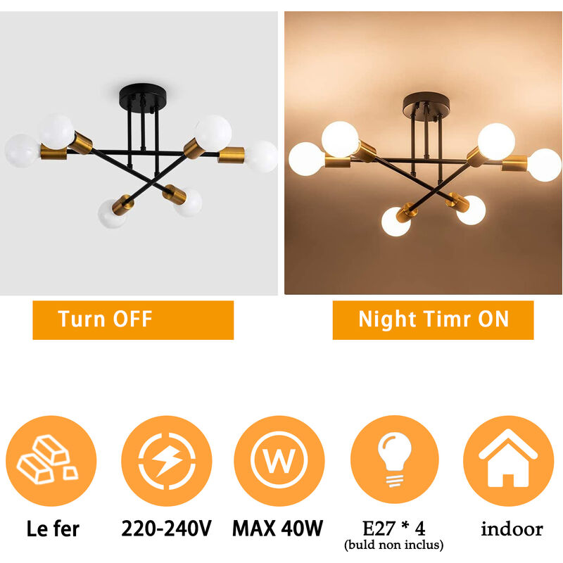 —‚ Material: galvanic surface in wrought iron metal —‚ Color: black and gold —‚ Socket: E27 —‚ Number of Lights Required: 6 Bulbs —‚ Bulb: LED, Edison, incandescent, compact fluorescent, halogen (not included) —‚ Maximum compatible power: 60 Watts Max —‚ Friendly reminder: To clean or replace the lamp during installation, the power must be turned off. |