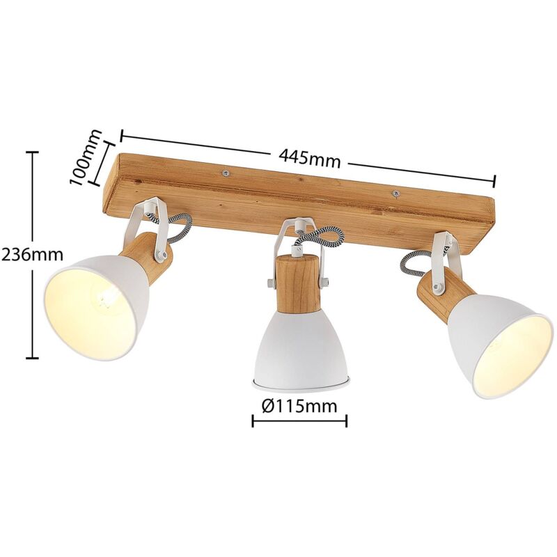 The Merela 3-bulb downlight made of wood and metal The Merela 3-bulb ceiling light brings a large portion of Scandinavian flair into any room, whether it be a living room, bedroom or hallway. This look is created by the combination of light pine wood and matt white lacquered metal and the design in a practical and simple spotlight shape. Each of the three spotlights can be individually positioned by turning and swivelling, so that different areas of the room can be accentuated with lighting.