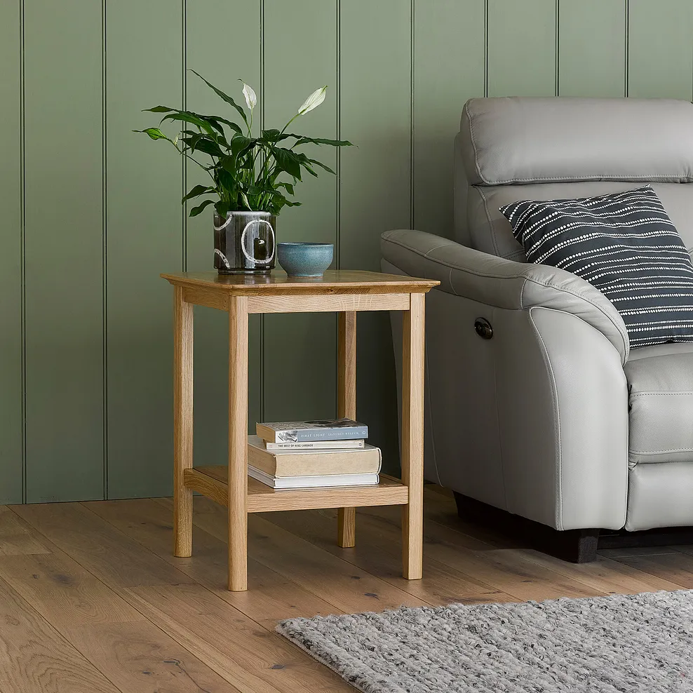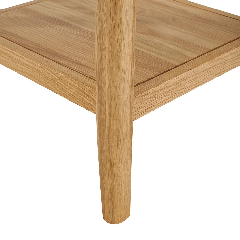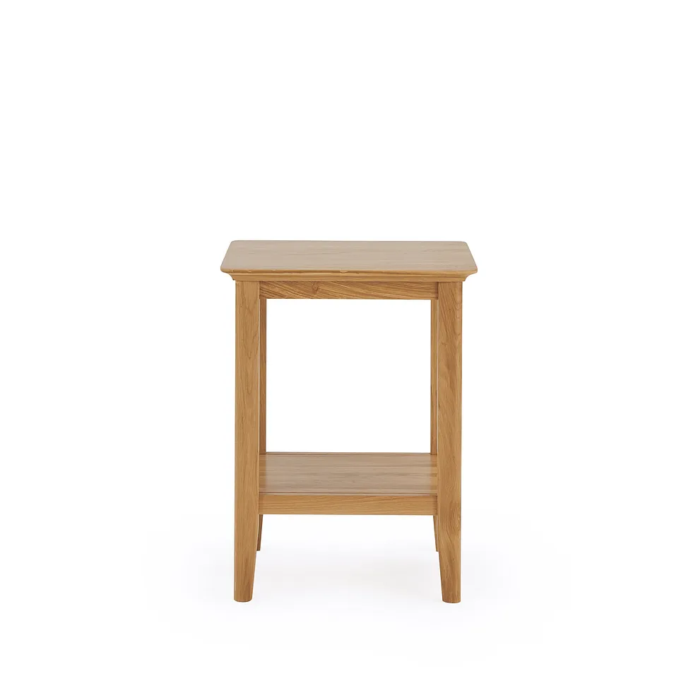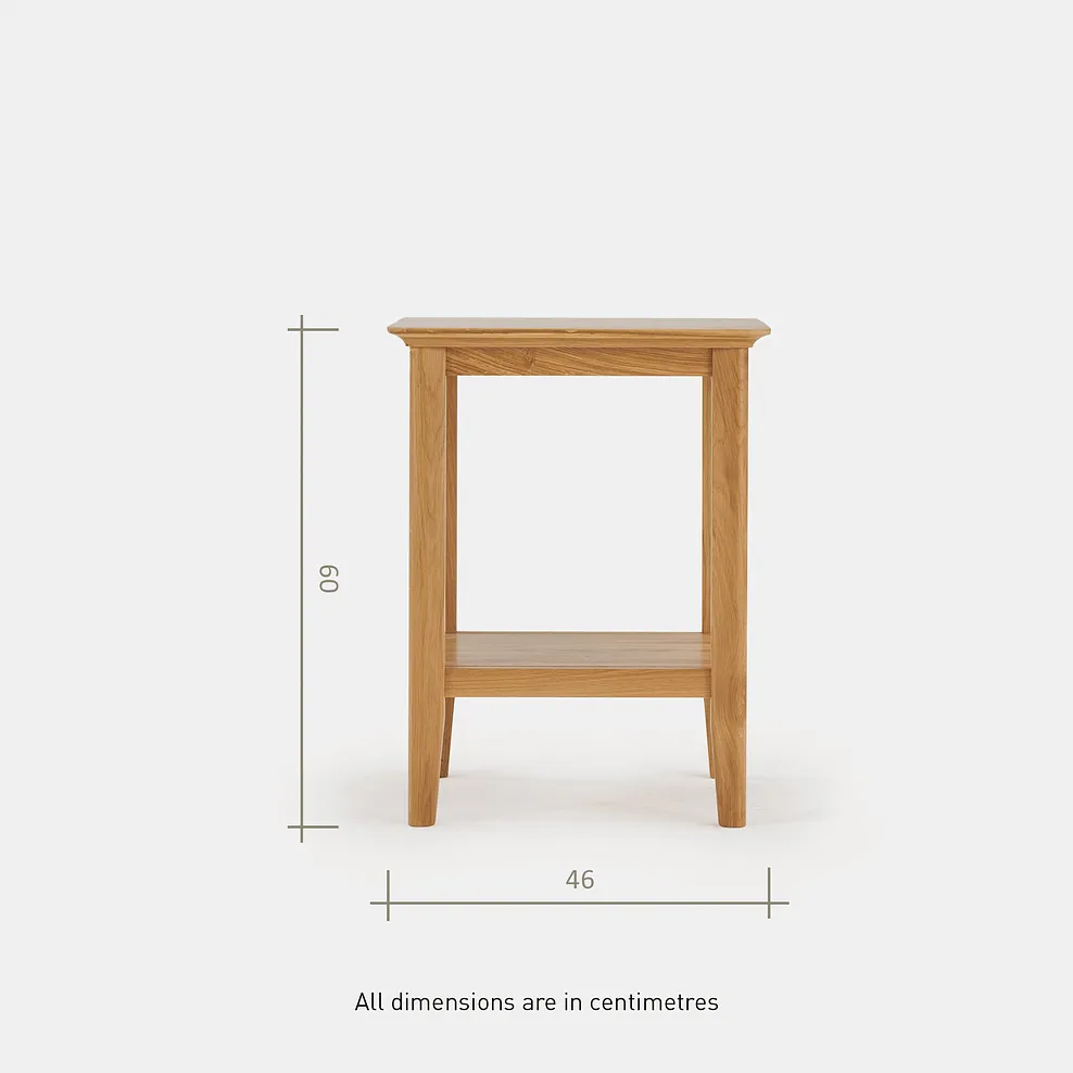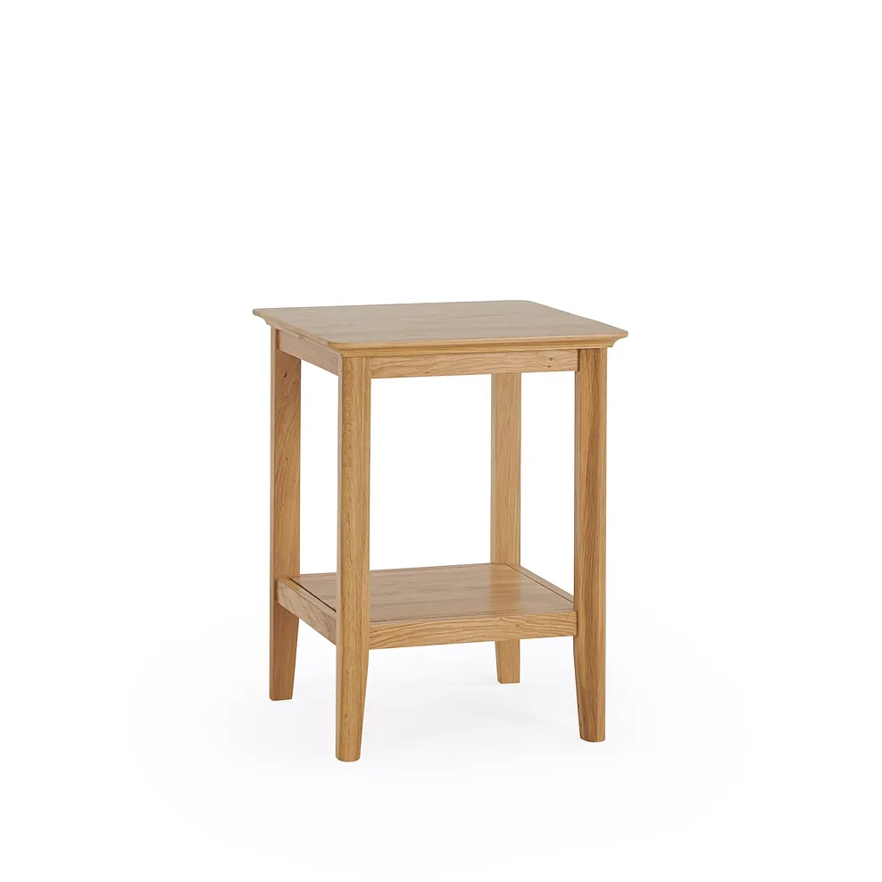 Simplicity. Sometimes, that’s all you need. Our Copenhagen side table is made from solid natural oak, built around a slender frame with tapered legs. Just right at the end of a sofa for lamp, with lower shelf for magazines or book. Team with other pieces for an understated look in your living room.