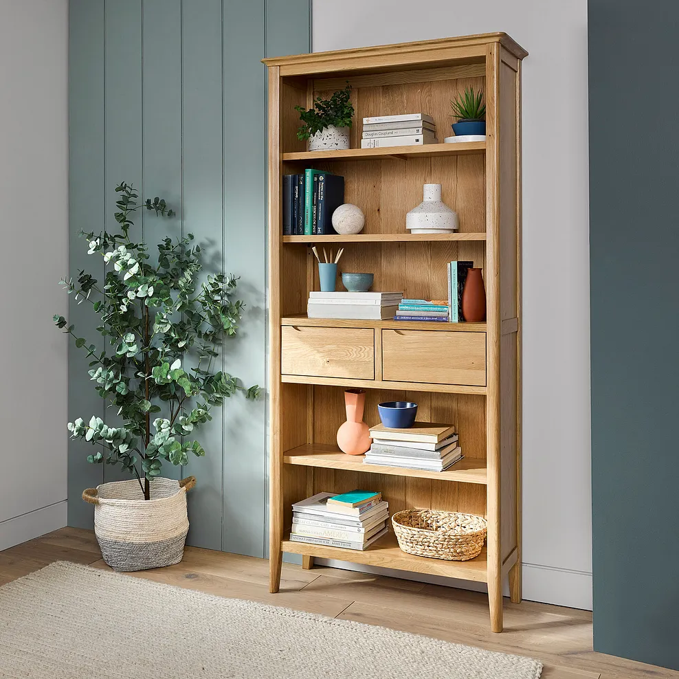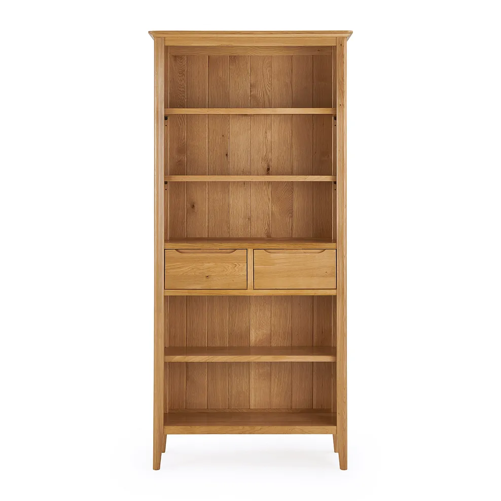 The Copenhagen tall bookcase has plenty of space for holding books, photos and ornaments. It also has two drawers at a handy height €“ display the good and hide away the clutter. With a lighter looking frame and rounded edges, Copenhagen is built to last from natural solid oak.