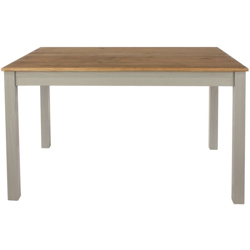 A practical solid wood dining table in contemporary plank top design with grey waxed finish underframe with antique waxed top surface.