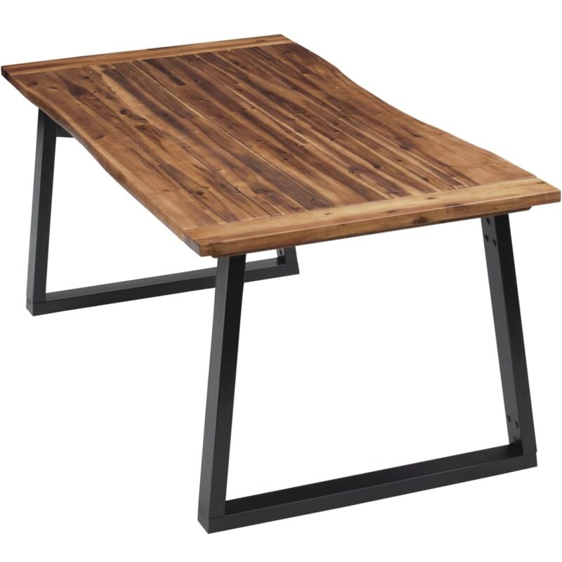 This high-quality wooden dining table features an industrial style, making it a great addition to your dining room or kitchen. It is sturdy and durable, with a solid acacia wood tabletop that showcases a live edge, enhancing its natural beauty. The unique U-shaped, powder-coated metal legs provide stability and complement the industrial design.