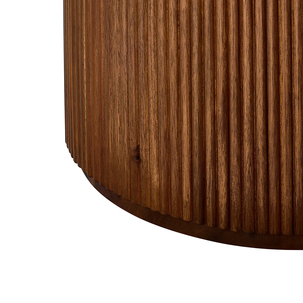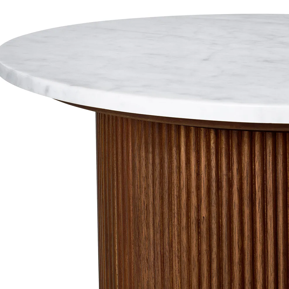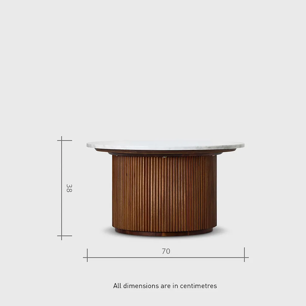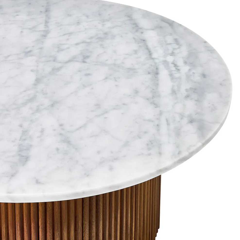 Designed to captivate, our Elba acacia and marble round coffee table brings elegance to any living space. The rich acacia base, with fluted detailing, provides a warm contrast to the cool Italian Carrara marble top, making it a timeless addition to contemporary homes. The marble€™s organic variations and elegant veining add individuality to every piece.