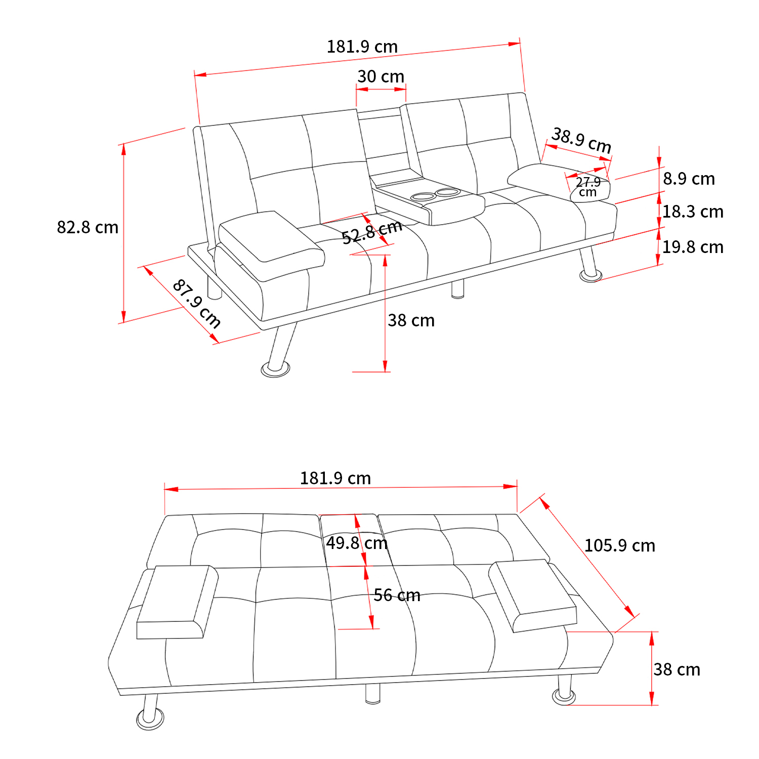 Sofa Bed SizeSofa size is 1820x880x830mm,when it is as a bed,size is 1820x1060x380mm,armrests on both sides can be detached,which give you more spacious