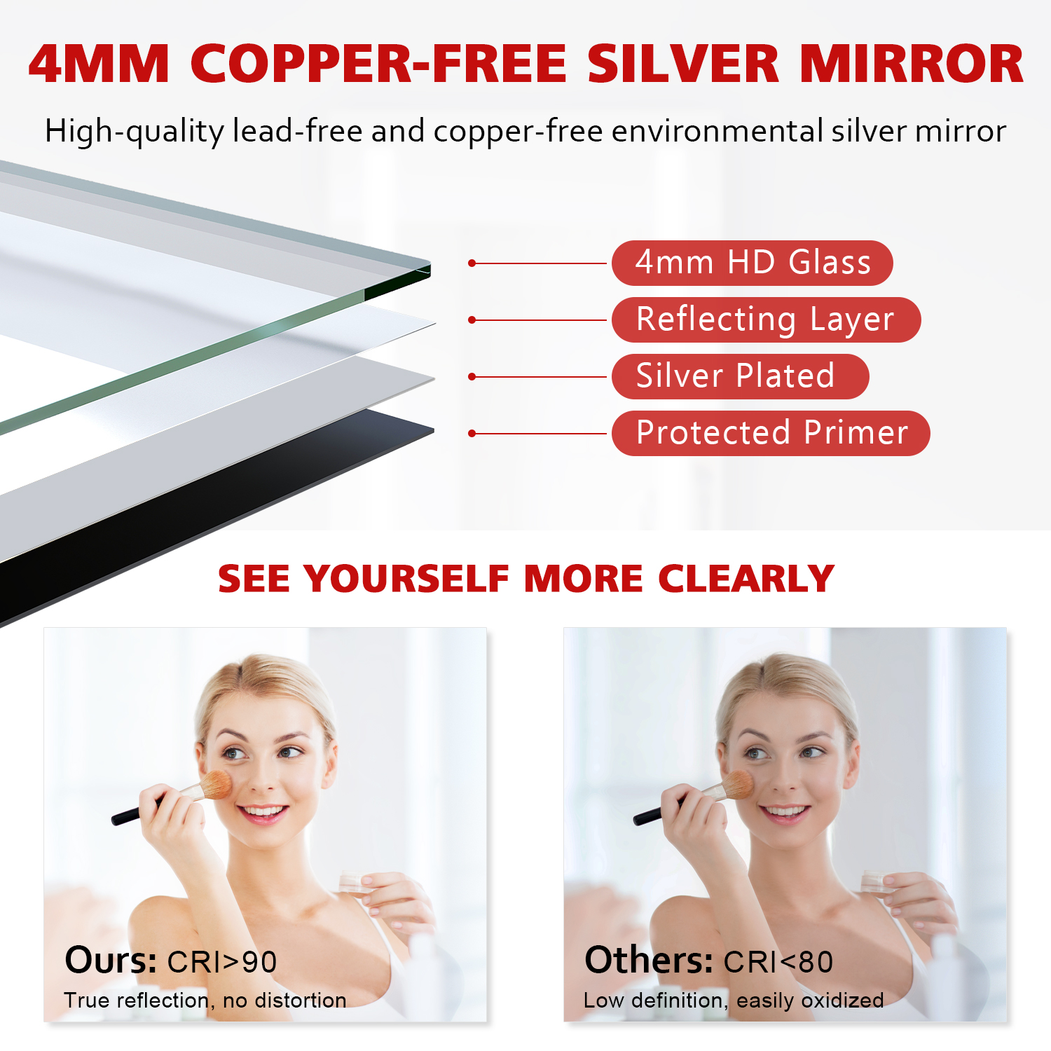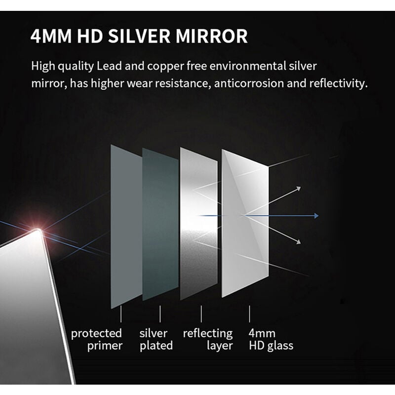 Â4mm Copper less Silver Mirror‘ – The mirror is 4mm thick and uses copperless silver mirror technology to ensure a clear and bright mirror image that is more resistant to corrosion.