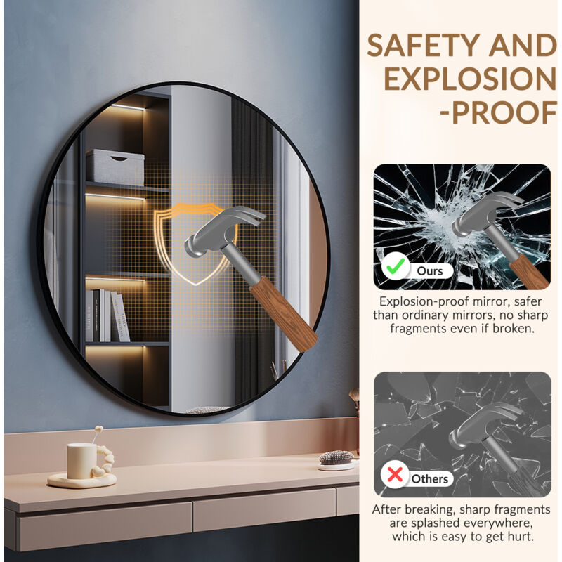 ÂHigh-Quality Aluminum Frame‘ – The mirror frame is made of sturdy aluminum, ensuring durability and stability. The surface is treated with a black powder coating, which not only enhances corrosion resistance but also gives the frame a stylish and minimalist appearance.