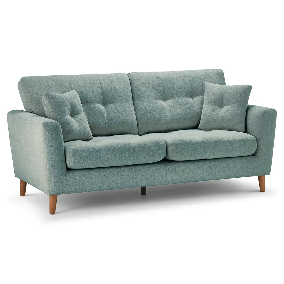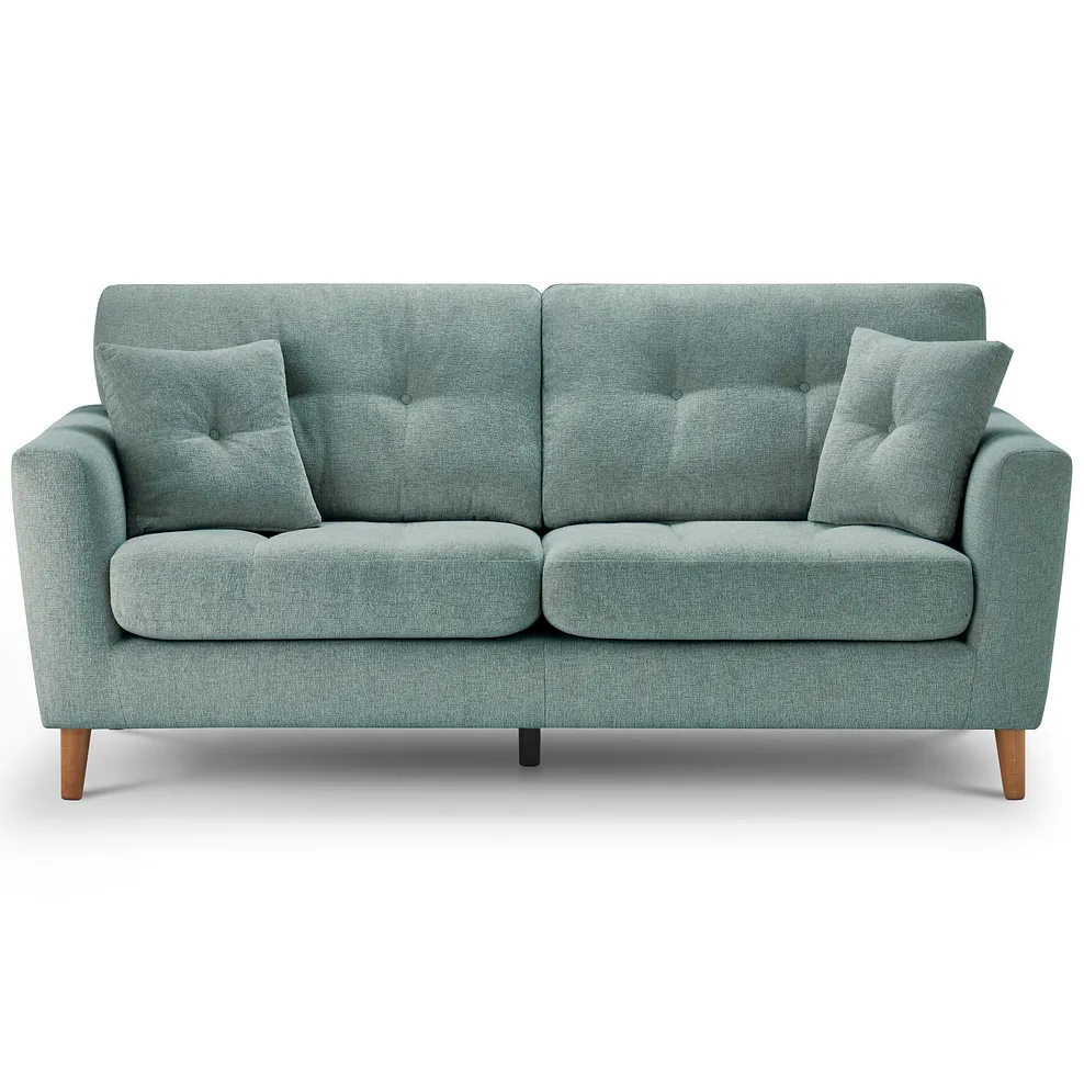 Our exclusive design features seats and backs upholstered with subtle blind stitching. Buttoned-back cushions showcase classic Scandi-inspired pinched detailing, while the two matching scatter cushions accent the look with a single covered deep button.