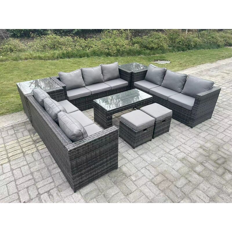 This classic sofa set can accommodate 11 people and features comfortable, soft cushion backs. It is made of premium dark grey rattan that withstands British weather.