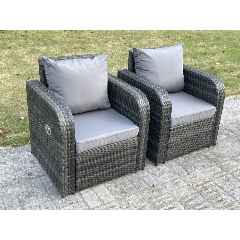 ¢ Dark grey mixed rattan with dark grey fabric .Color may some difference due to light or monitor .we are unable to return the item due to color problem . The 2 armchairs are adjustable, you can adjust the inclination of the chair back from 90°-130° through the button .