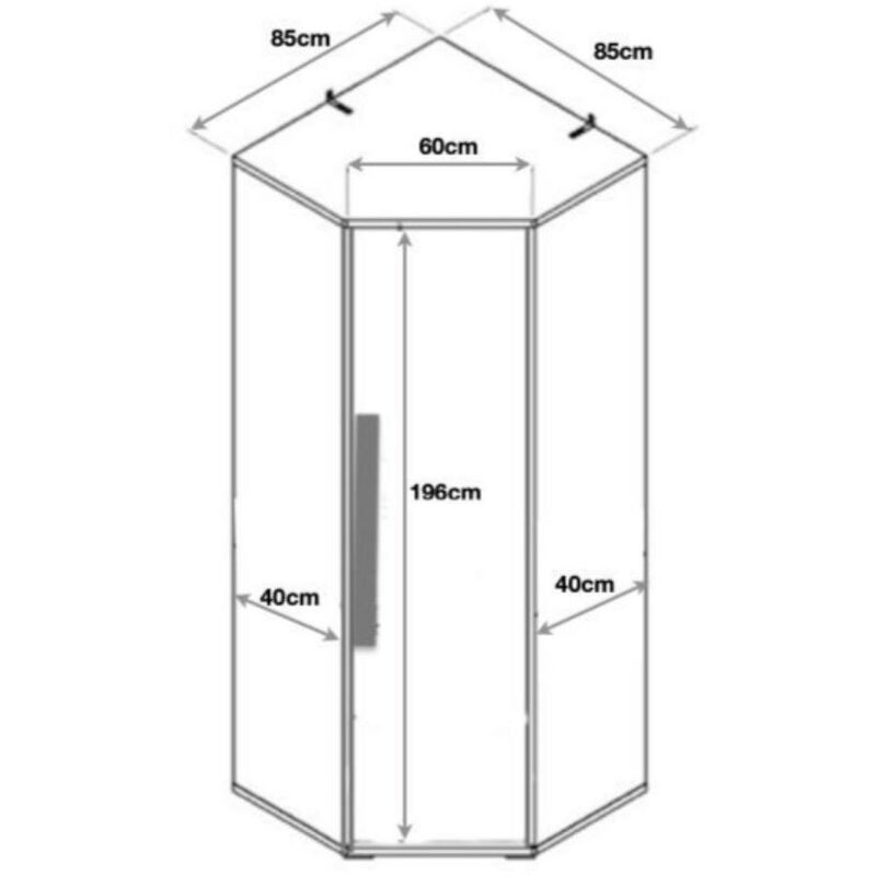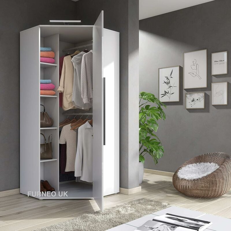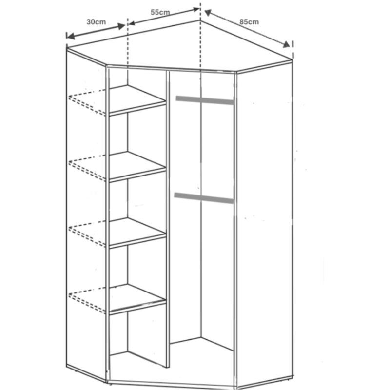 The wardrobe is characterised by a single hinged door with four shelves, and double hanging rail, one high, one mid height. It is ideal for bedrooms with limited space. The wardrobe can be assembled with the door opening to the left or the right.