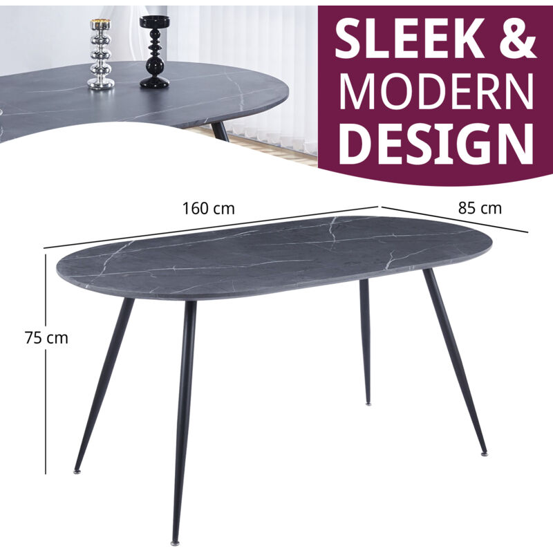 Infuse sophistication into your dining space with our elegant dining table featuring a 160cm grey marble effect oval-shaped tabletop. The luxurious marble effect, reminiscent of timeless beauty, serves as a striking focal point for your dining room. Supported by black metal legs, powder-coated for durability, this table not only ensures stability but also introduces a contemporary and sleek design element. The oval shape promotes a sense of intimacy, making it an ideal centerpiece for family gatherings or intimate dinners. The harmonious blend of the grey marble effect and black metal legs creates a visually appealing contrast, elevating the overall aesthetic of your dining area.