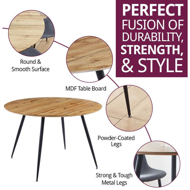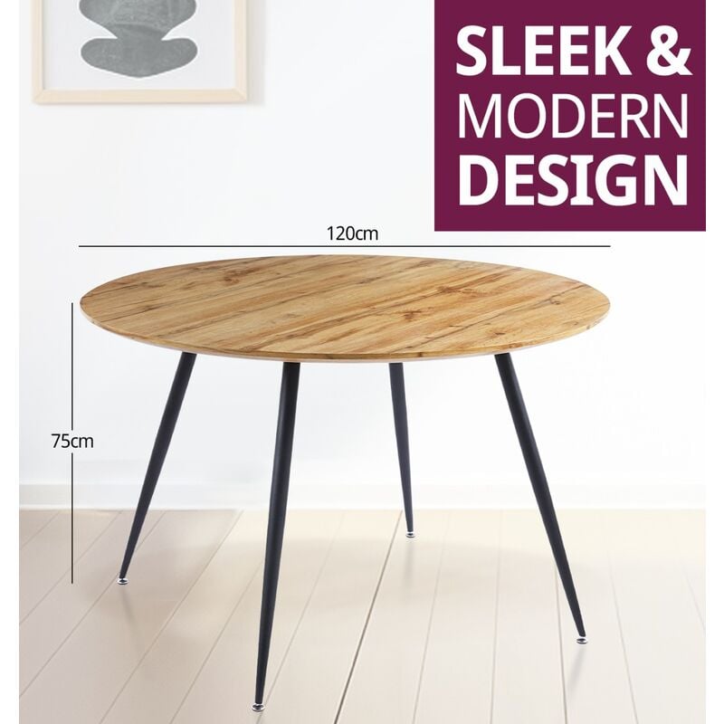 This stylish table with oak effect top and powder-coated legs is guaranteed to turn heads and catch the eye wherever it is placed in the home. The laminated board of the table is strong and sturdy and instantly appealing with its oak effect finish; it is the perfect foil for the stylish black legs. The round table can be accommodated in rooms of any size with ease. What’s more, the table is as versatile as it is stylish.