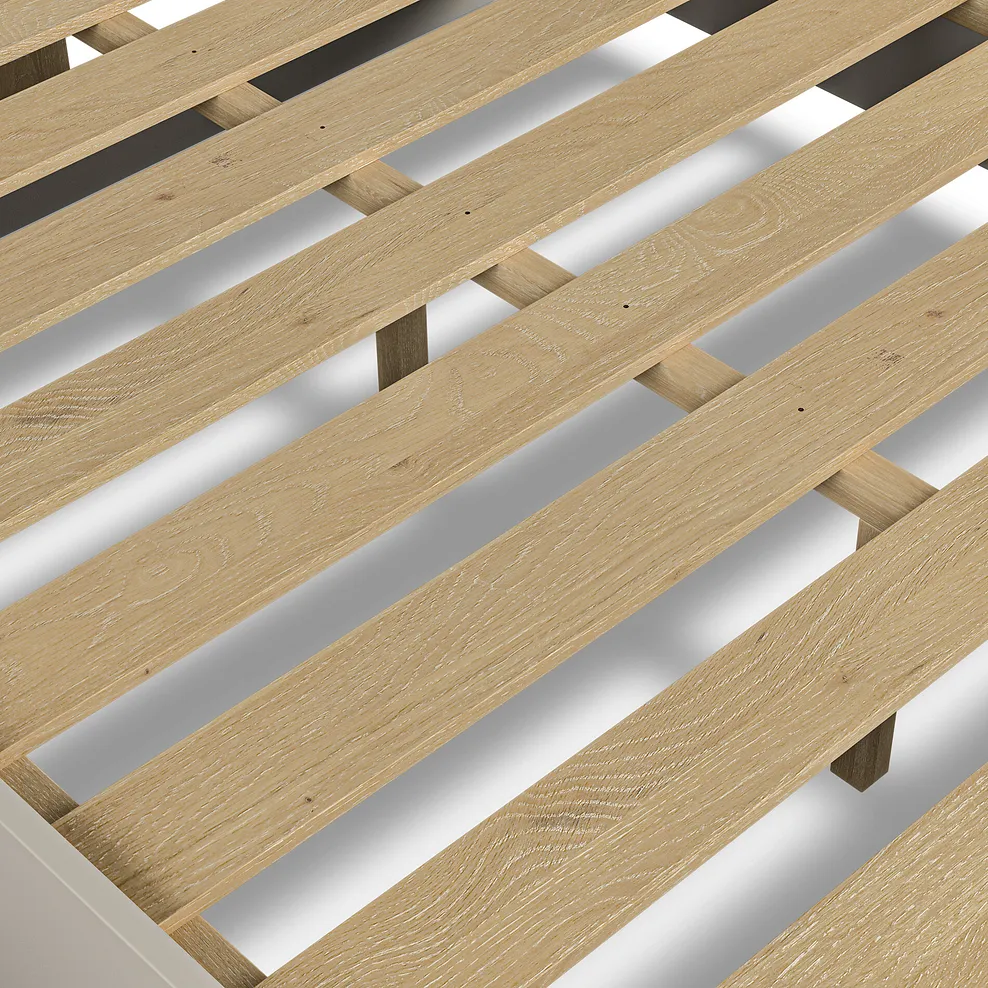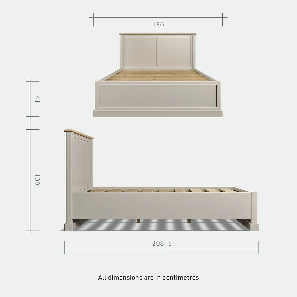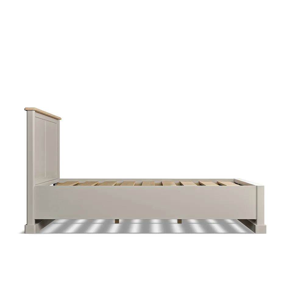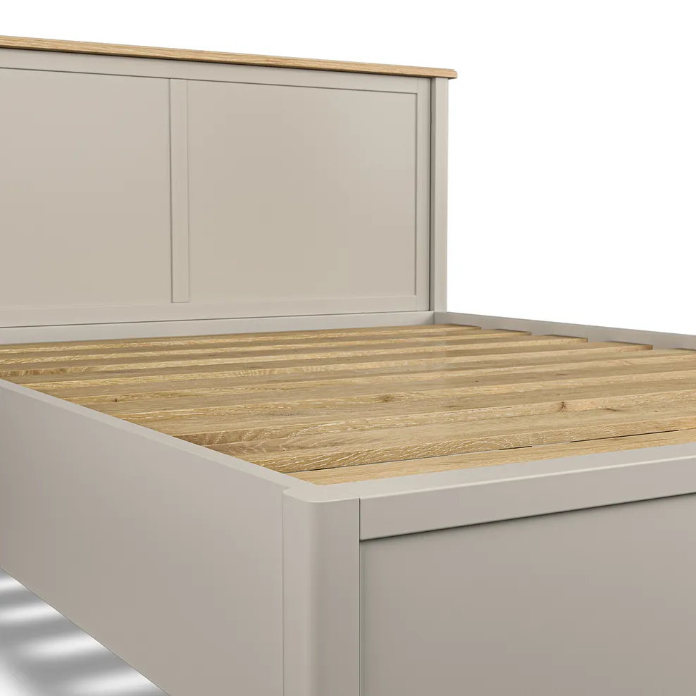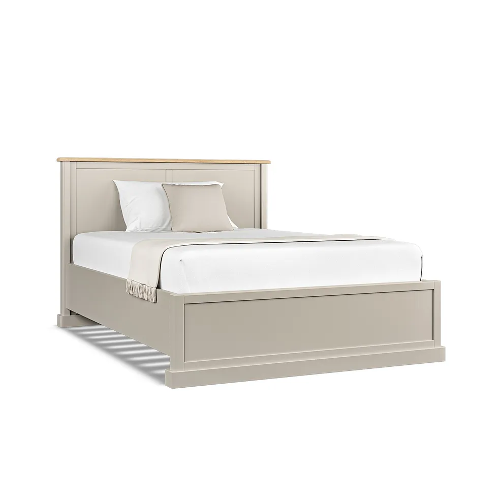 Introduce elegant farmhouse style to your bedroom with our Henley oak and painted acacia double bed. The warm stone-coloured finish and natural oak details of the classic design make it easy to match with any decor for a timeless bedroom look.