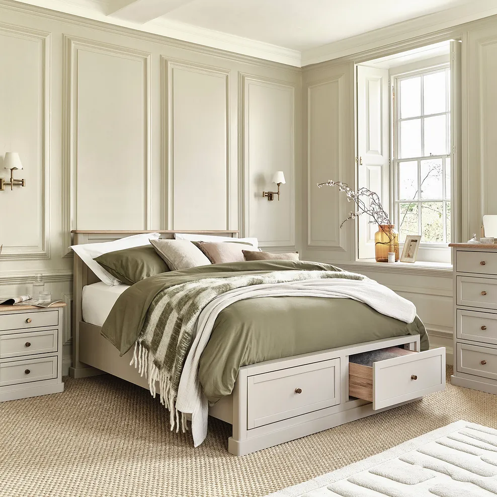 Transform your bedroom into a clutter-free space with our Henley king-size storage bed. The painted acacia and oak bed benefits from easy-access pull-out drawers for keeping spare bedding, blankets, clothes and more.