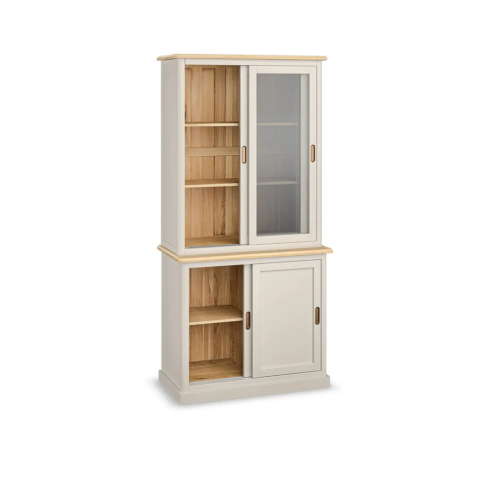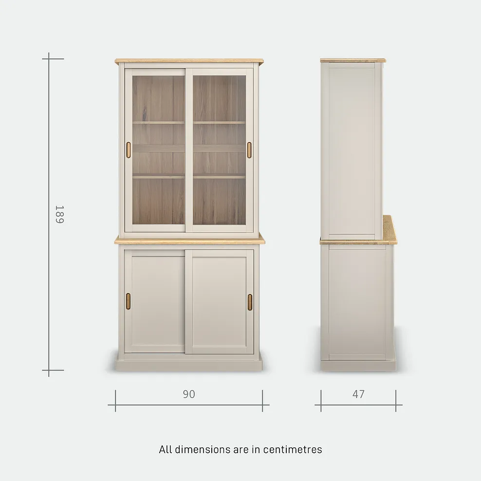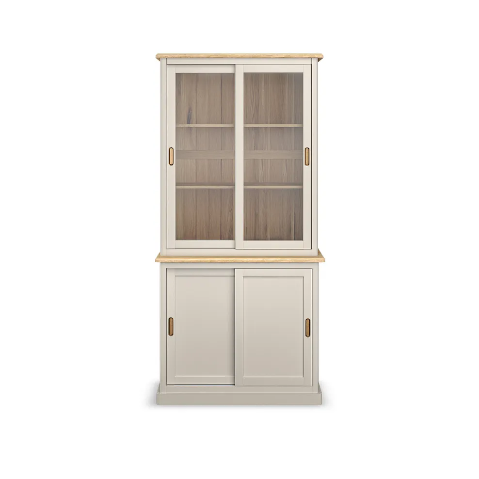 The glass-fronted top offers the perfect backdrop for displaying all your favourite decorative objects, while the low-level storage is a handy home for linens, tableware and more. Sliding doors with brass-coloured hardware give it a contemporary feel that€™s practical and space-saving.