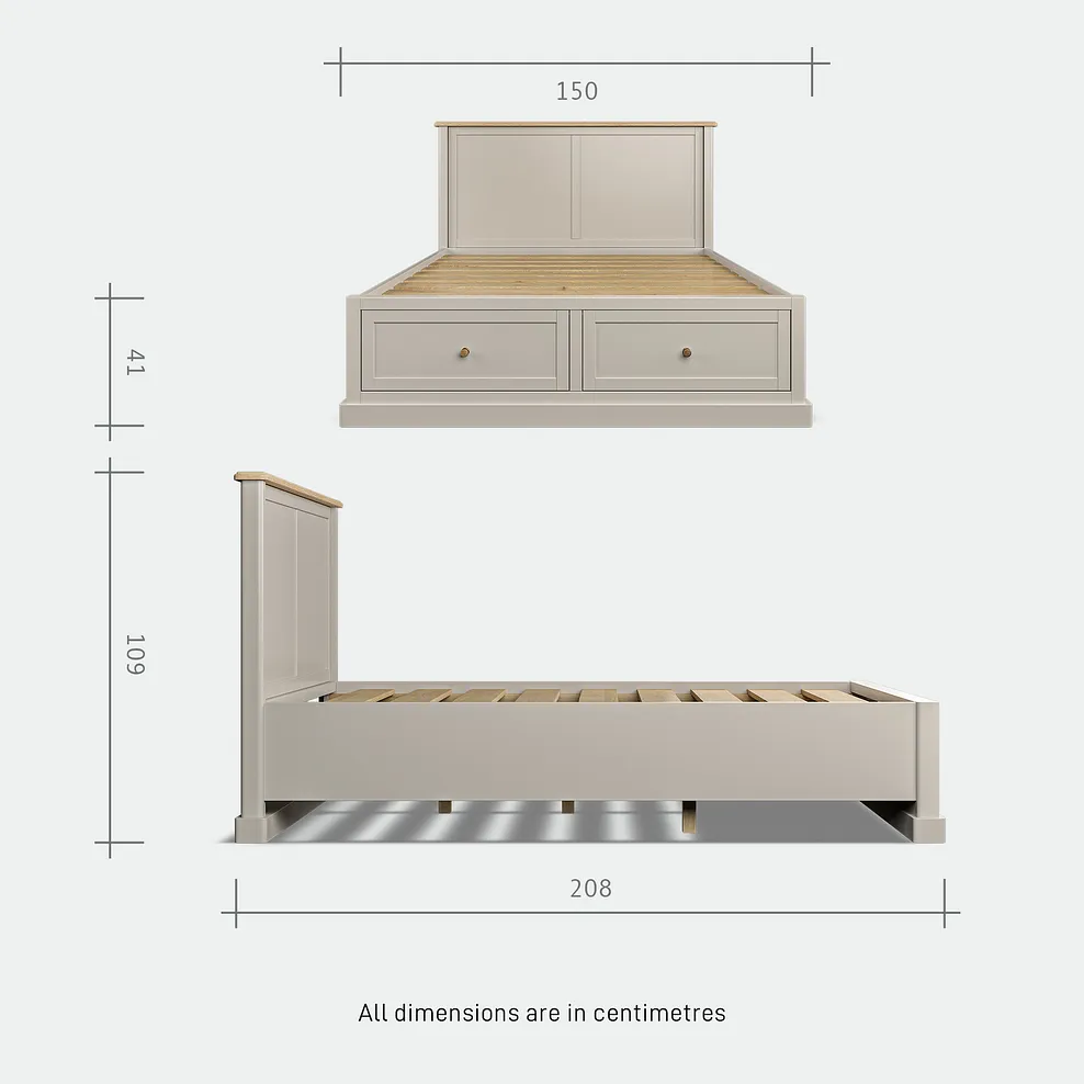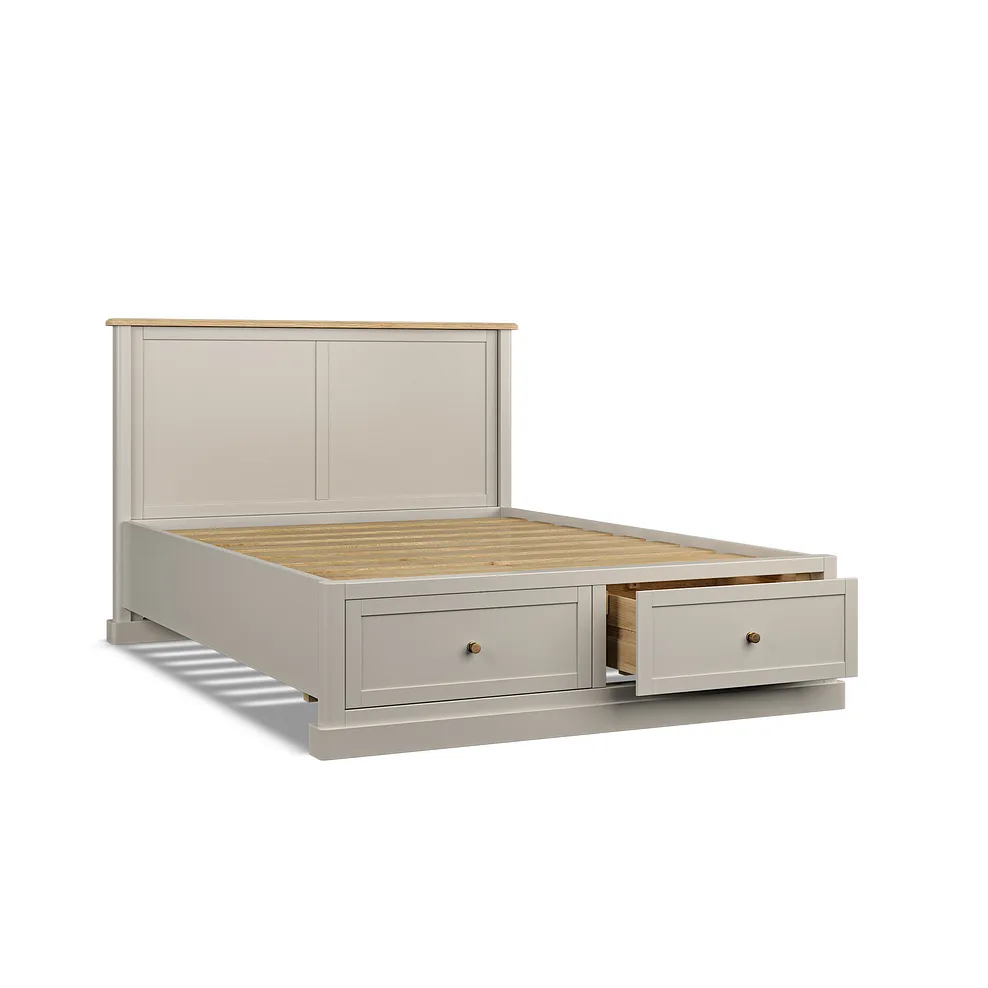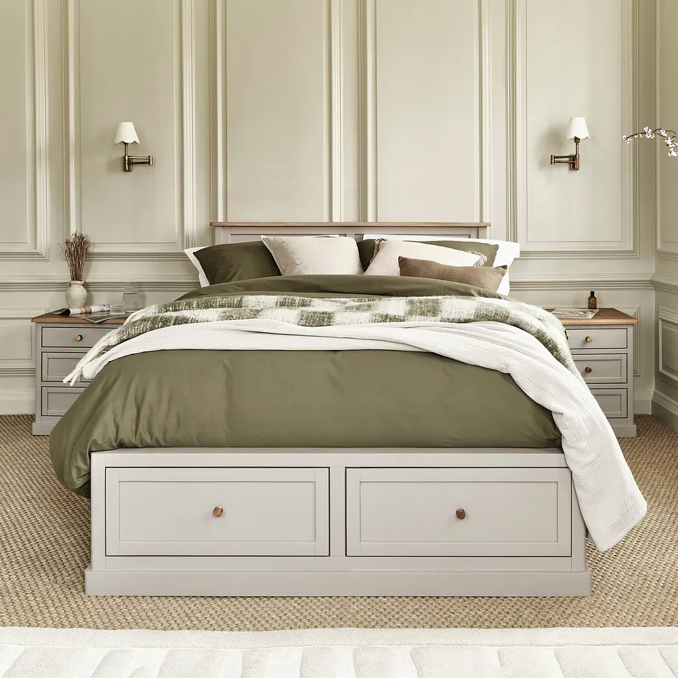 Add space-saving style to your bedroom with our Henley double storage bed. The oak and painted acacia bed combines elegant farmhouse-inspired design with handy drawer storage for spare bedding and out-of-season clothes.