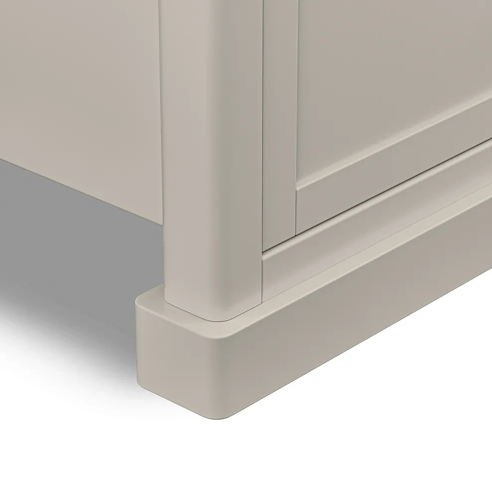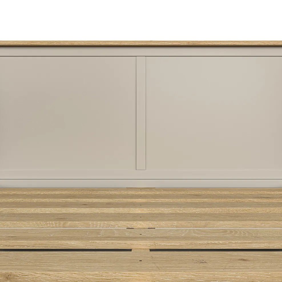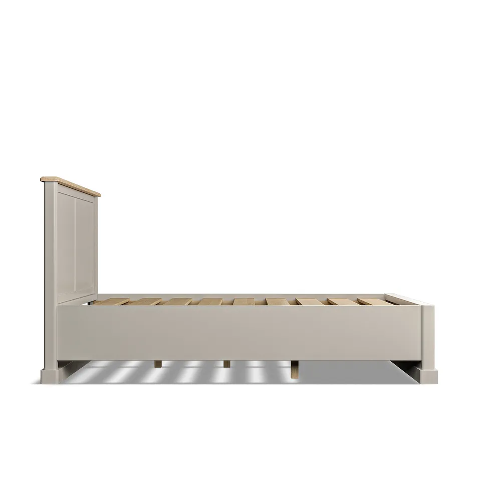 The warm stone-coloured finish and natural oak detail give the bed a modern easy-to-match feel that€™s accented with the brass-look drawer handles.