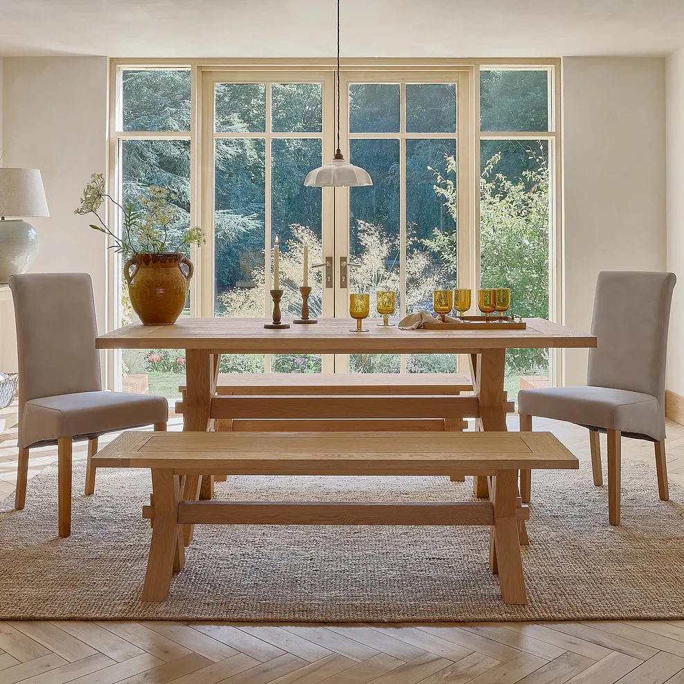 Bring warmth, comfort, and timeless style to your dining space with the Highworth Oak Dining Table set, complete with two benches and two scroll back chairs upholstered in a soft dapple beige fabric. The benches provide practical, space-saving seating, while the scroll back chairs add a touch of elegance and extra comfort with their supportive design and smooth fabric finish. Together, they create the perfect balance of casual charm and refined style.