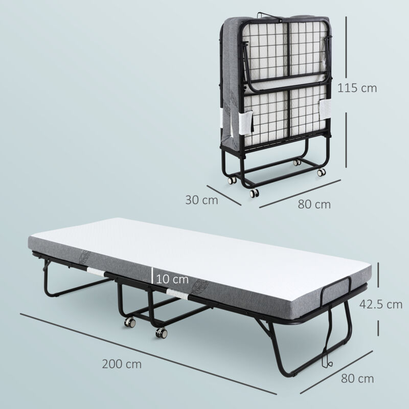 Last minute overnight guests? No problem. This HOMCOM wheeled single bed is so easy to move and gives you a restful sleep, wherever it stays. The metal frame is strong, with the four long legs giving balance. It comes with a top mattress – 10cm thick and soft, it will keep you comfortable with just the right amount of support. Four wheels on the base mean you can move it around easily from room to room – two lock into place so no moving once ready. And when done, simply fold in half to store.