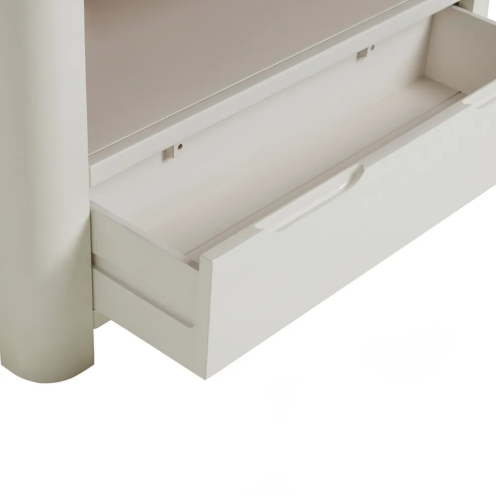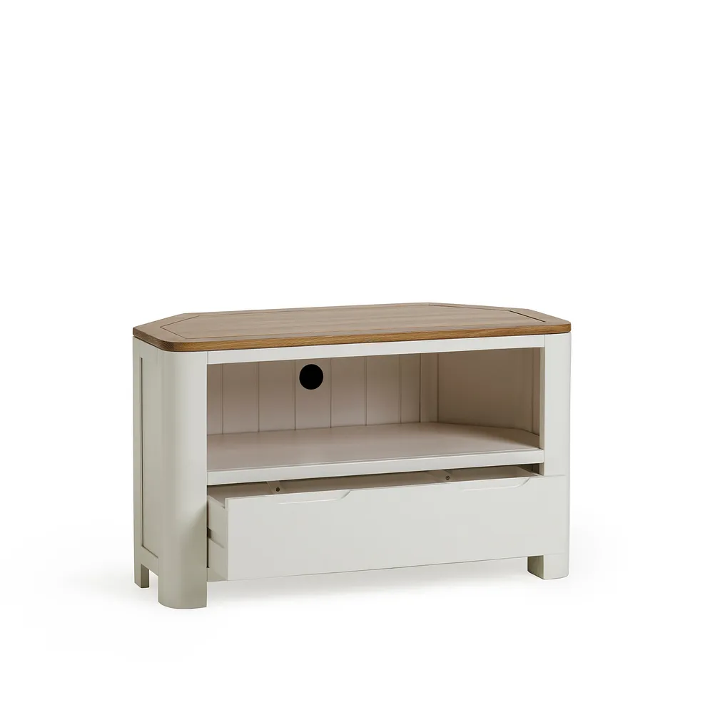 The Hove corner TV stand will tuck neatly away, making the most of space, keeping equipment and accessories tidy and all in one place. The corner in the name is the only corner you€™ll find in the Hove style, which has simple curves and smooth recessed handles at its heart. This cabinet has a solid oak top, and hardwood base with chalk white finish. The wide drawer at the bottom will hide away any clutter, and there€™s a specially made hole in the back for easy cabling. Browse the range and be inspired to add more Hove to your home. It€™s an unfussy retro modern style for family living. And don€™t forget to check our delivery options.