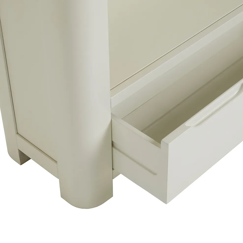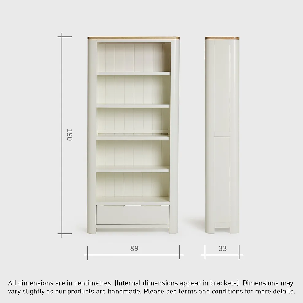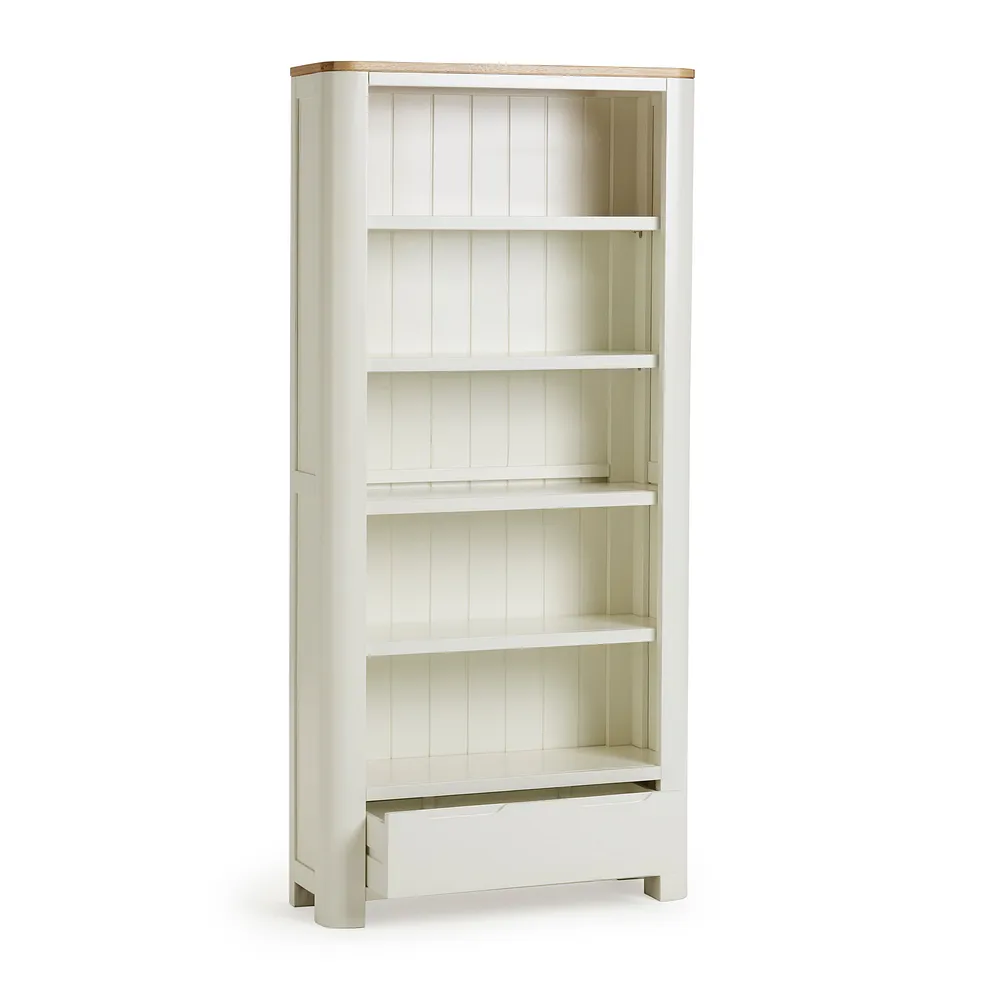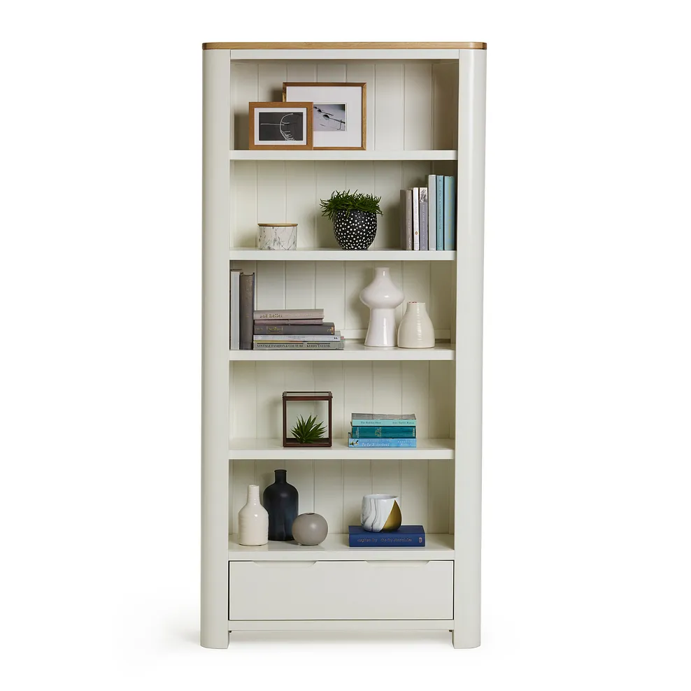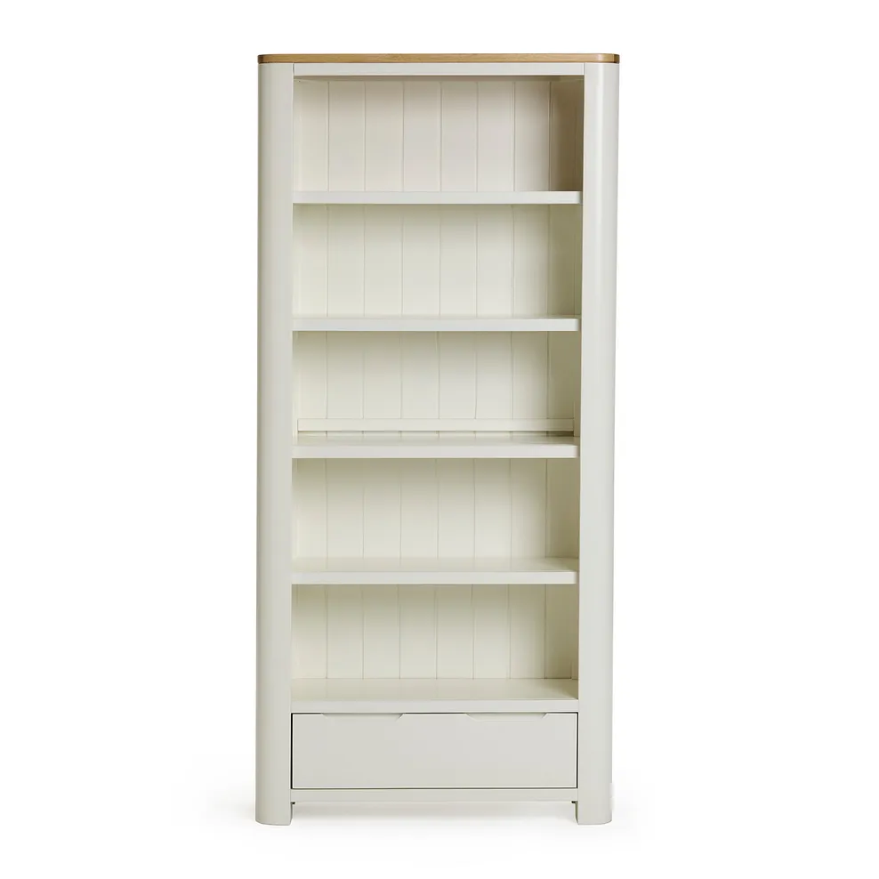 The tall bookcase from our Hove range has a young, modern look. The strong frame with rounded corners holds five shelves, and deep, wide drawer at the base. Legs grow on from the frame, lifting the case from the floor. Solid hardwood all through, Hove has a chalk white finish with natural oak on the top. The feel is pared back, and retro modern. Hove is designed be an unfussy backdrop to family living. Look through the range for more Hove inspiration €“ you€™ll find pieces for all round the home. Remember to check our delivery options.