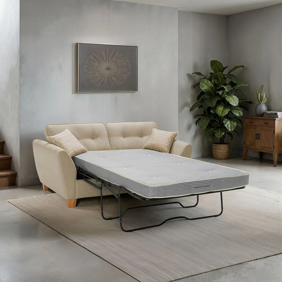 Enjoy the subtle retro style of Inca’s geometric scatter cushions, convex arms and solid oak legs while ensuring you’re always ready to host with the Inca 2-seater sofa bed. A simple 2-fold mechanism opens to reveal a high-quality yet compact 10cm deep sprung mattress on a flexible polypropylene deck, making it easy to transition from sofa to bed and back again. Place this stylish sofa bed in a spare room, office or living room to create a comfortable multi-purpose space.
