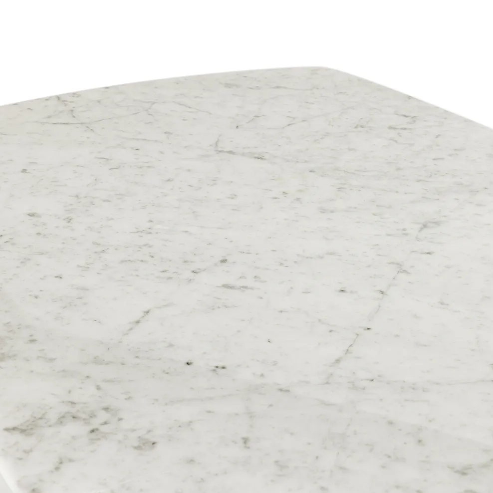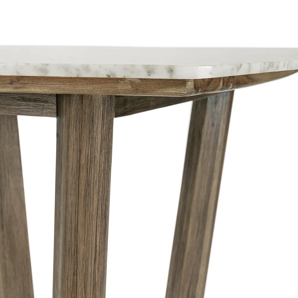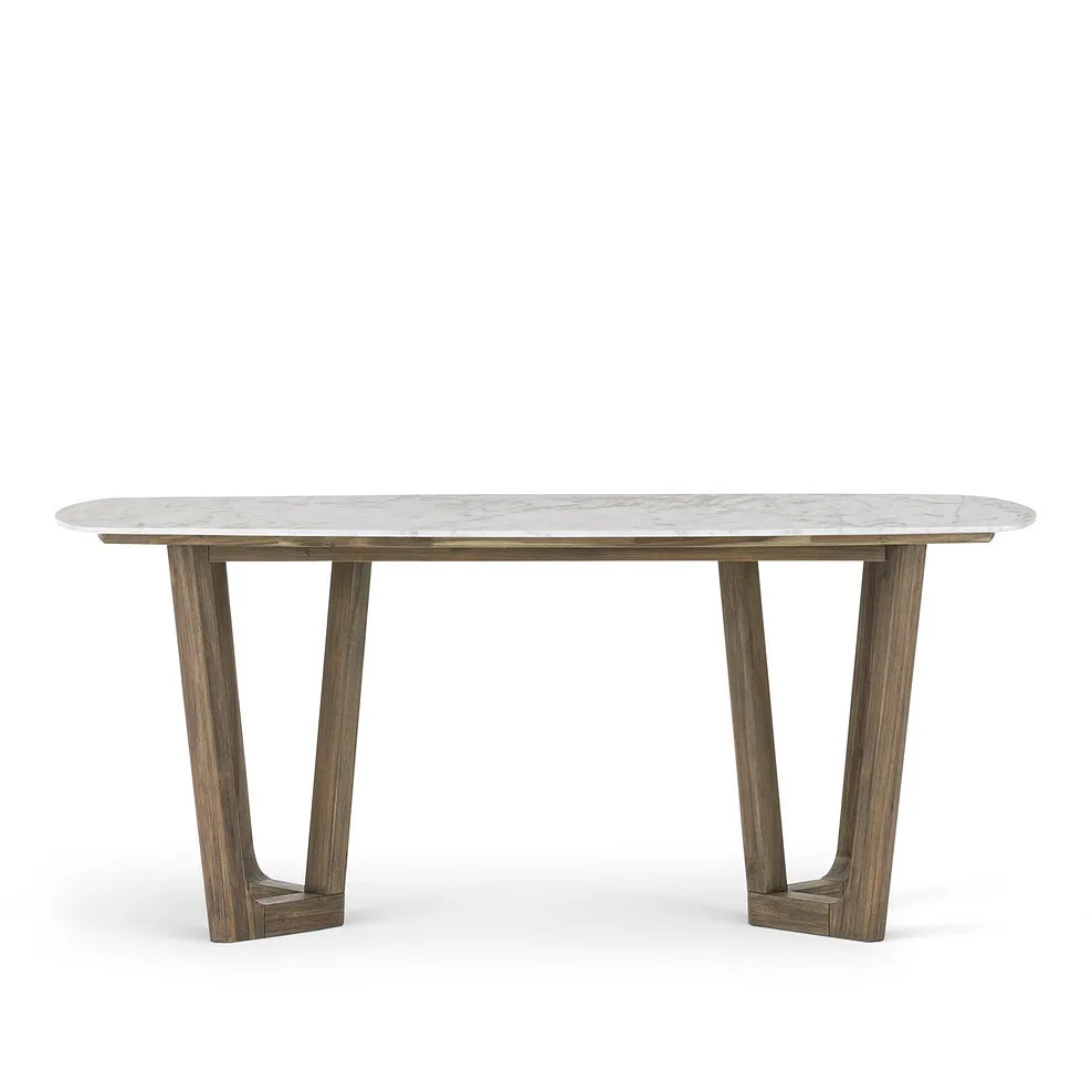 Topped with polished Italian Carrara marble, the exclusive table design features natural white and grey veining and softly rounded edges. The frame is made from contrasting dark wire-brushed acacia with geometric-inspired legs that give an eye-catching yet sophisticated feel.