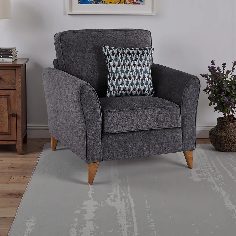 Get cosy without compromising on style with our Jasmine armchair. Upholstered in soft, tactile fabric and accompanied by a patterned accent cushion, this armchair will slot easily into a modern interior accented by minimal soft furnishings. Team this armchair with a sofa and footstool from our Jasmine range, or set it alongside a small table and lamp to create a snug reading nook.