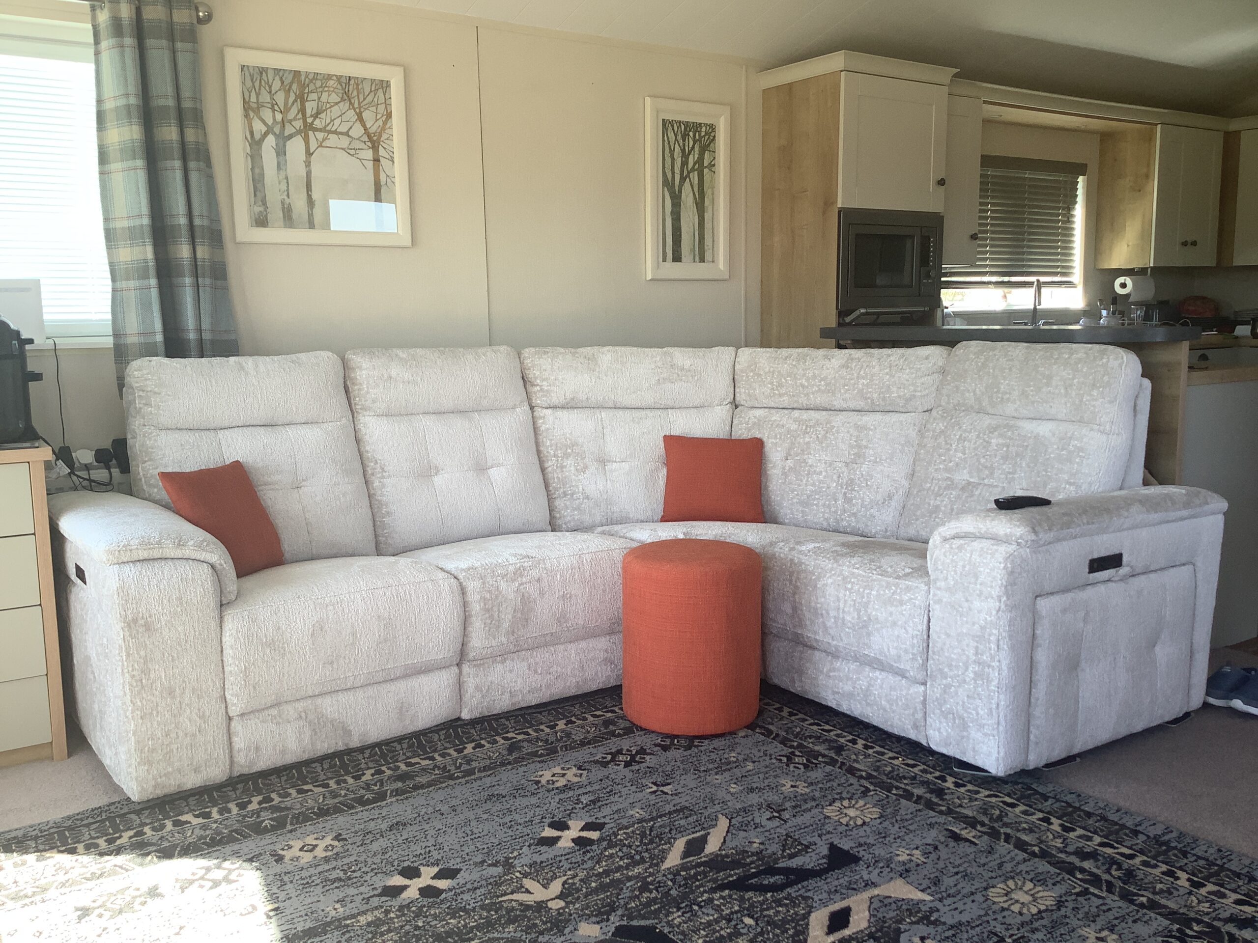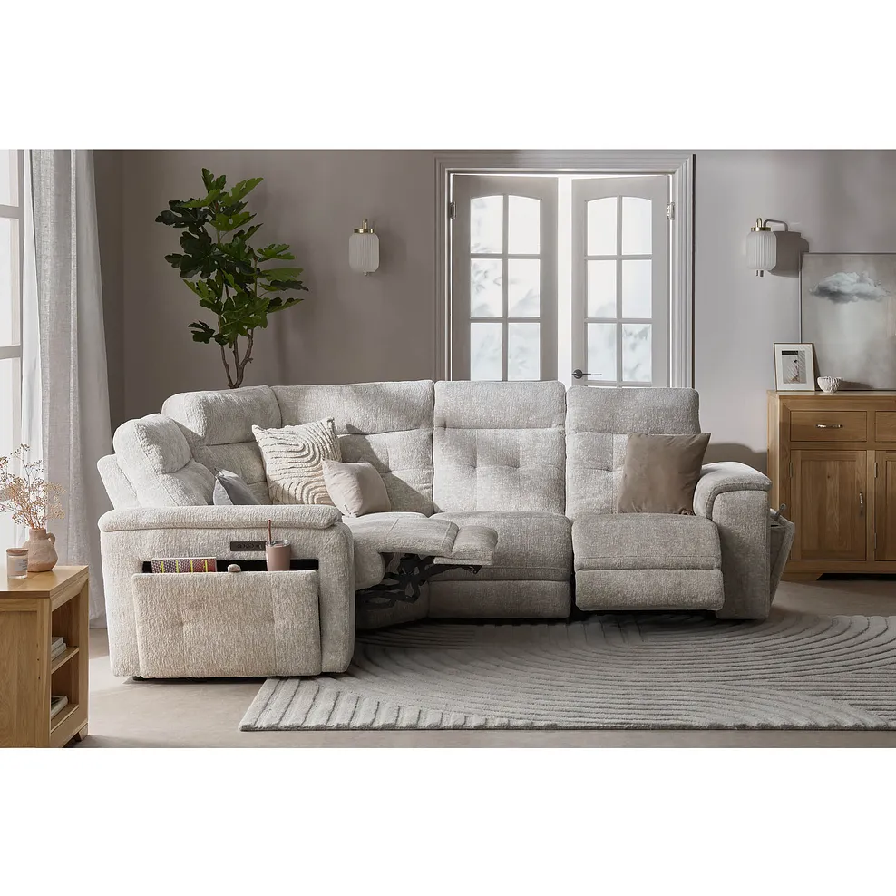 Elevate your living room game with our Juno right-hand facing, 4-seater corner sofa in Koto Turtle Dove fabric with power recliner and headrest. Sit back in style and enjoy the added benefit of arm storage with hidden cup holders so refreshments are always close at hand. Available in 3 luxurious fabrics, 9 colours, and several different size variations, there’s a Juno to suit every living room space. Whether you like to snuggle in front of the TV or invite your friends over for get-togethers, the Juno corner sofa will be the perfect addition to your home.