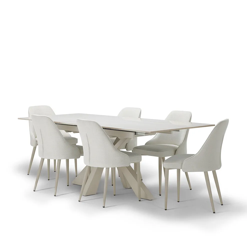 Matched with six Aria chairs in soft cream, this set strikes the perfect balance between modern elegance and everyday comfort. Whether it€™s a casual catch-up or a celebratory meal, Kobi brings the whole room together.