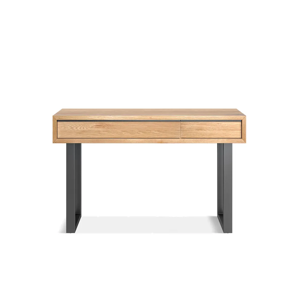 Made from solid oak throughout, Maine features a low-sheen finish that reveals the wood€™s warm tones and natural grain, creating a smooth sophisticated look. Contrasting charcoal metal hardware includes sled-style legs and full-length slim handles that are flush with the frame edge. Two pull-out drawers offer ample storage.