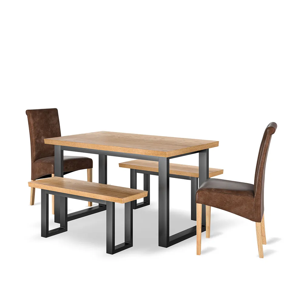 Two matching oak and metal Maine benches and two modern Scroll Back chairs feature solid oak legs and are upholstered in Vintage brown leather-look fabric for added style and comfort. The high-back design offers cushioning to support your back, while the upholstered finish brings a stylish touch to your dining space.