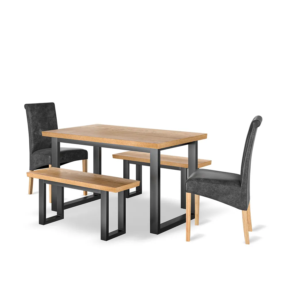 Two matching oak and metal Maine benches and two modern Scroll Back chairs feature solid oak legs and are upholstered in Vintage black leather-look fabric for added style and comfort. The high-back design offers cushioning to support your back, while the upholstered finish brings a stylish touch to your dining space.