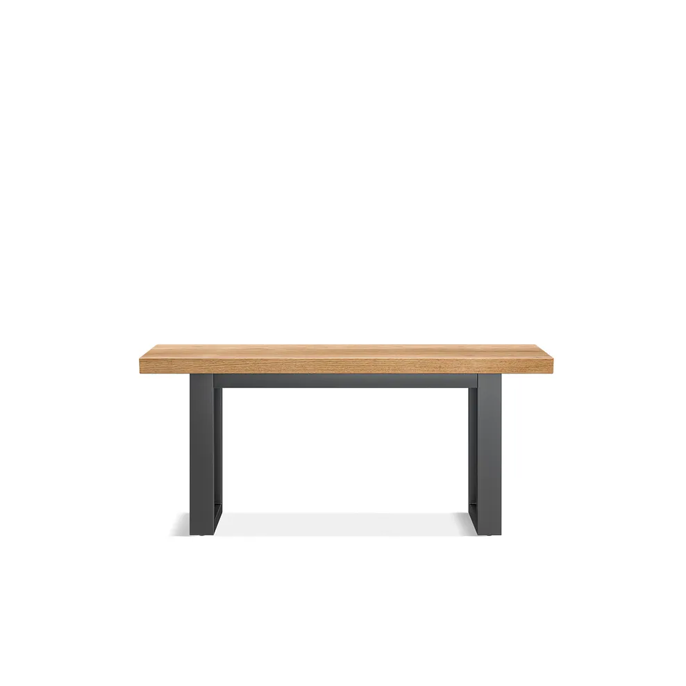 Full of laidback simplicity, the Maine dining table features a solid oak top with a low sheen finish. This beautifully shows the warm tones and natural detail of the wood€™s grain. Sled-style metal legs in a contrasting charcoal tone elevate the exclusive design and add to the range€™s minimalist look.