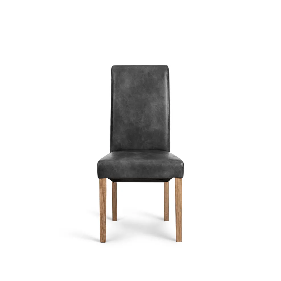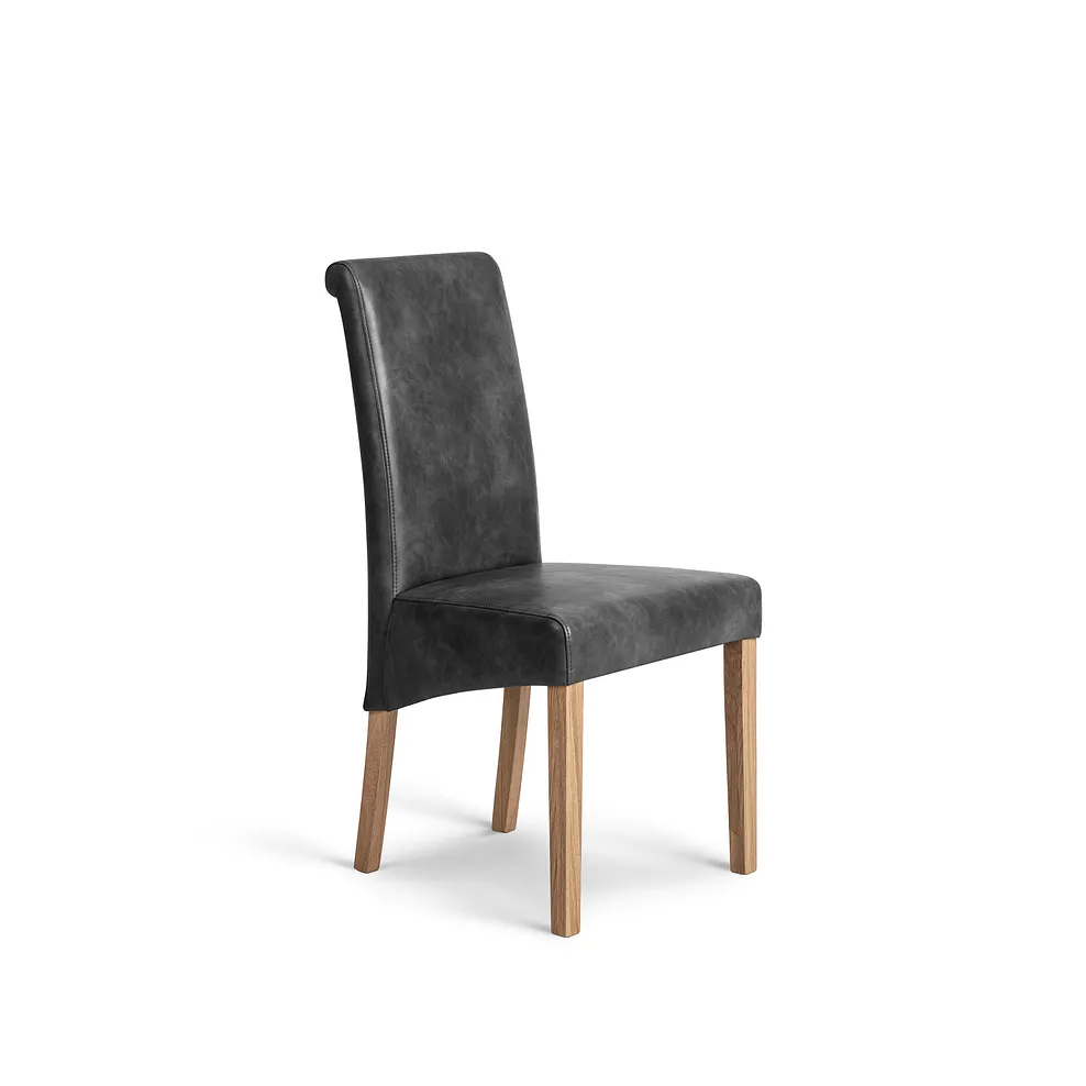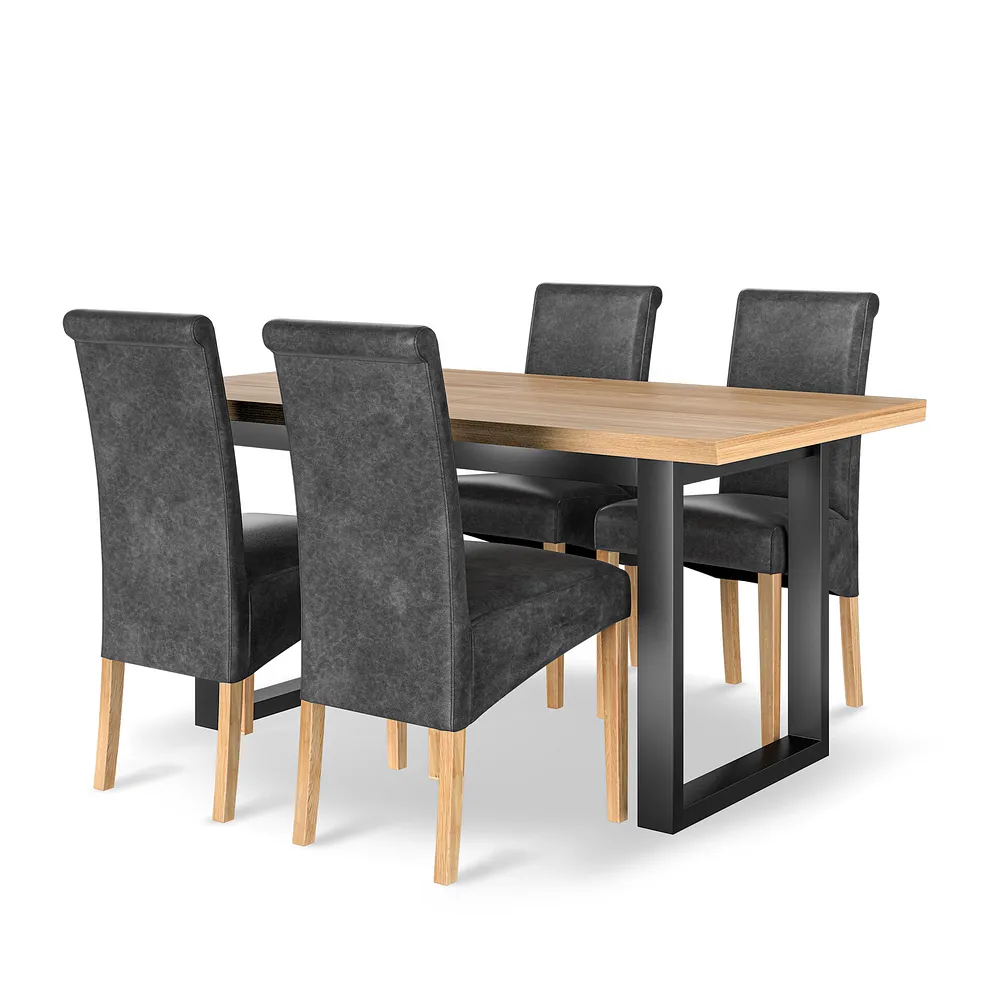 The exclusive design is elevated on sled-style metal legs in a charcoal tone. Four modern scroll-back chairs feature solid oak legs and are upholstered in Vintage black leather-look fabric for added style and comfort. The high-back design offers cushioning to support your back, while the upholstered finish brings a stylish touch to your dining space.