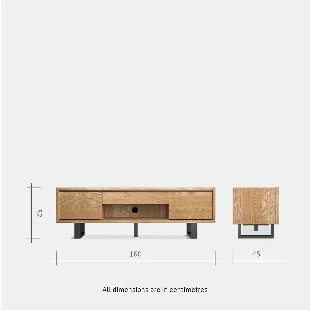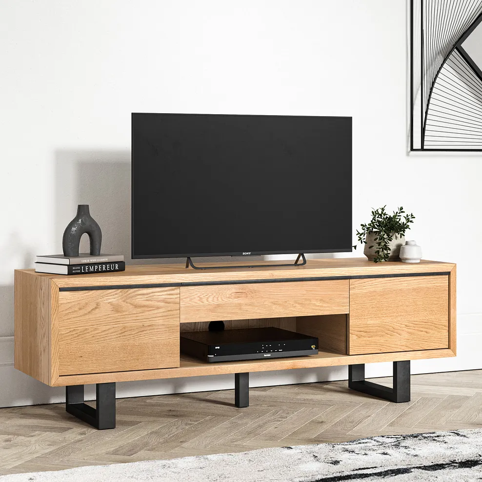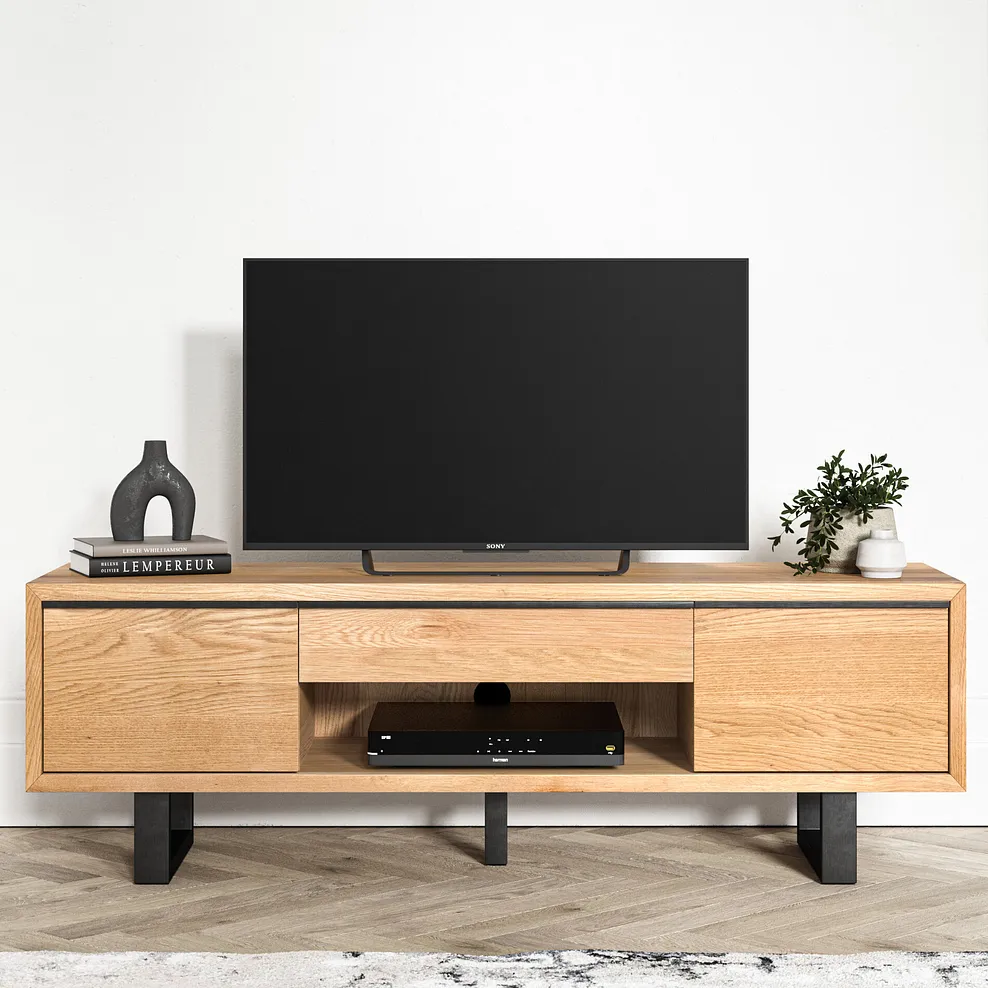 The exclusive solid oak design features two closed cupboards plus a central open shelf for easy-to-access electronics and a handy pull-out drawer for everyday living room items.