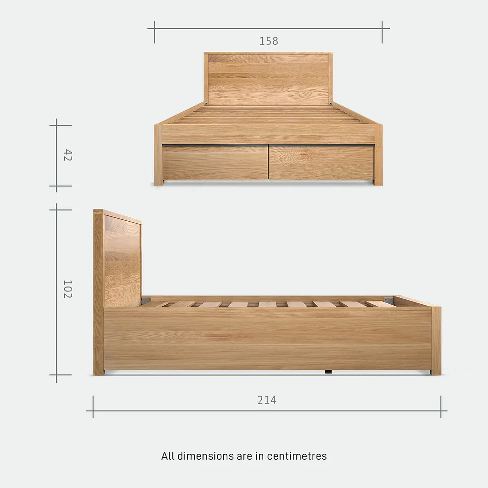 Two roomy pull-out base drawers, complete with charcoal metal full-length slim handles that are flush with the frame edge, offer handy store-away space that’s a perfect home for your out-of-season wardrobe.